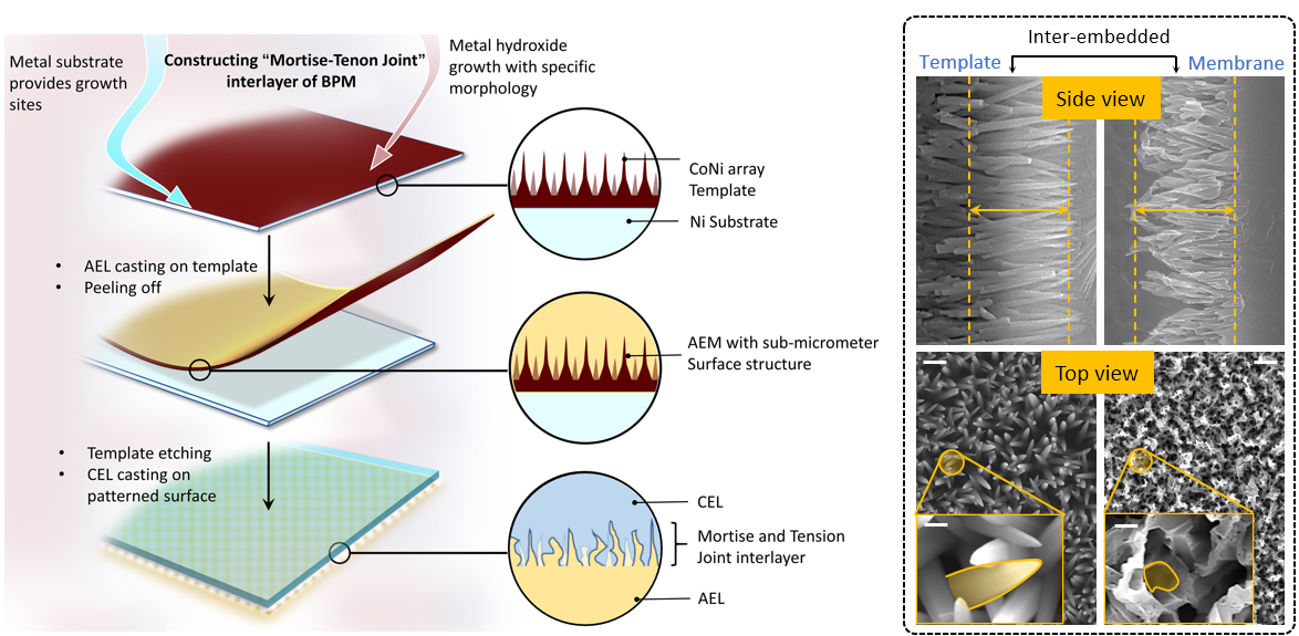 图1.“榫卯”结构物理互锁中间层双极膜的设计与制备