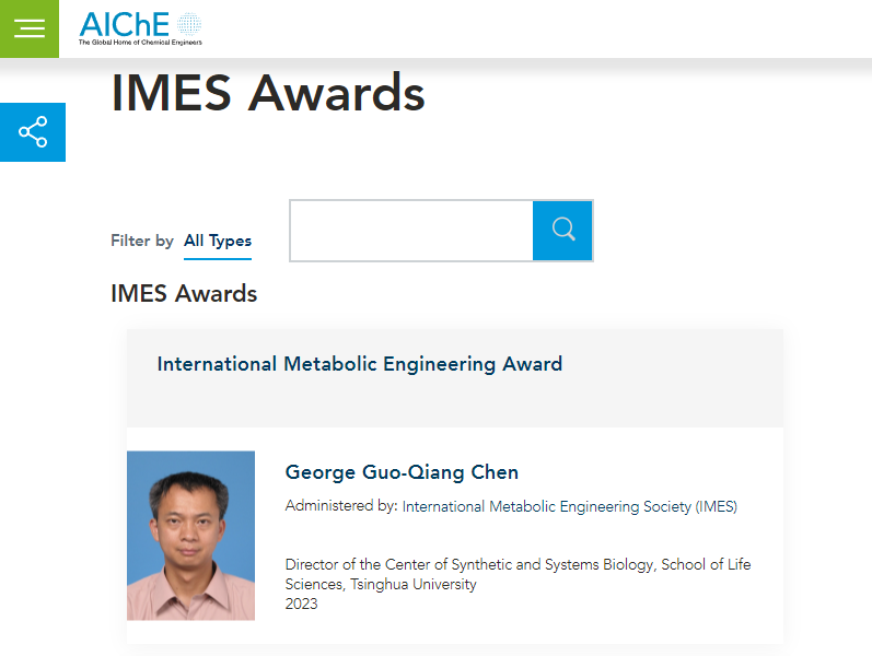 清华新闻网3月30日电 3月24日,国际代谢工程学会(International Metabolic Engineering Society, IMES)在其官方平台宣布,将2023年度国际代谢工程奖(IMES Award)授予中国学者,清华大学生命科学学院教授、合成与系统生物学中心主任陈国强,以表彰他通过开发利用嗜盐菌和“下一代工业生物技术(NGIB)”对全球代谢工程领域作出的卓越贡献。