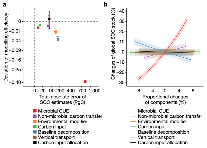 研究将描述复杂土壤碳循环的机理模型与五万多条土壤碳观测数据相融合,在贝叶斯框架下确定了微生物过程对土壤有机碳储存最可能的控制路径。结果表明,在全球范围内,微生物碳利用效率与土壤有机碳储量正相关(图2),微生物代谢中对有机合成较高的碳分配比例最终导致了土壤有机碳的积累而不是流失。