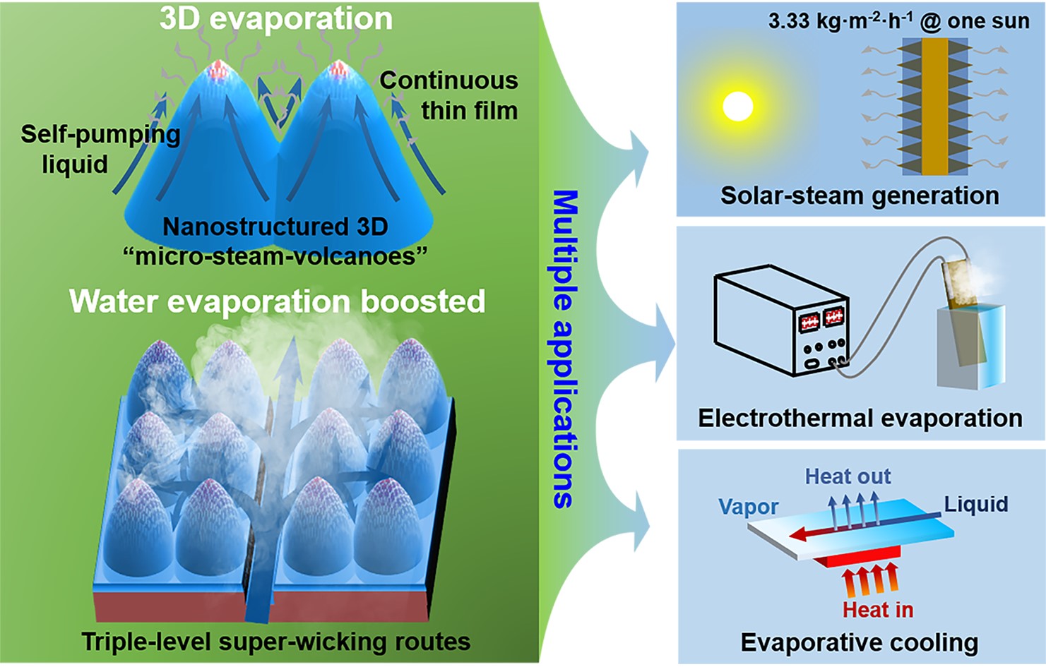 图1.激光制备三级毛细路径吸液高效液膜蒸发复合微纳结构与多场景蒸发功能
