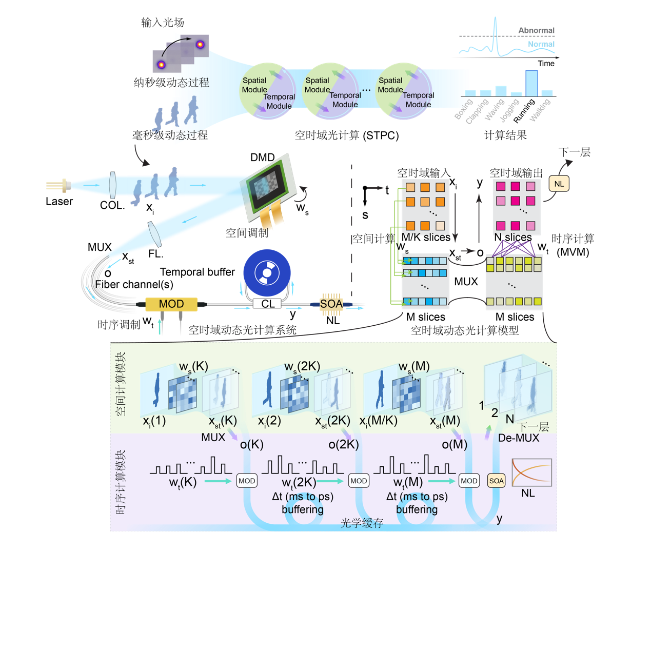 近日,清华大学电子系方璐副教授课题组建立了空时域超快智能光计算架构,提出了跨维度空时域匹配方法和联合空时域矩阵向量光计算模型,首次实现了三维空时域智能光计算系统,突破了数字内存读写的掣肘,将动态机器视觉处理速度提升三个数量级(达到纳秒量级)。