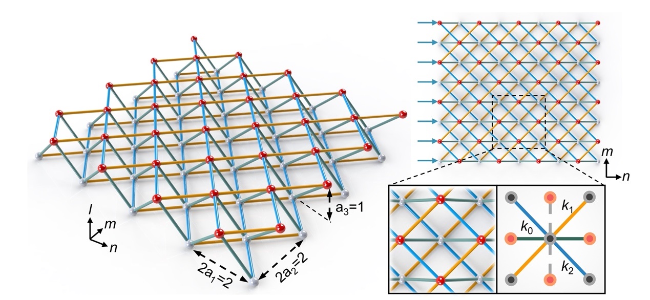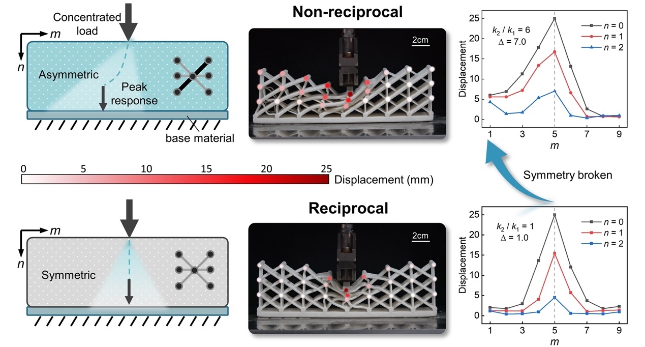 最近,清华大学航天航空学院陈常青教授课题组利用力学超材料点阵结构,将低维非保守系统中的弹性波时域动力学演化行为,等效映射为空间尺度上高维点阵结构的静态变形模式,从而在一个静态的保守系统中实现了非厄米拓扑效应(图1)。相较于非厄米动力学系统,该静态系统中仅通过改变点阵的几何构型便能实现非厄米及等效非互易效应,而无需任何主动调控或能量注入,极大地降低了非厄米效应的触发条件(图2)。