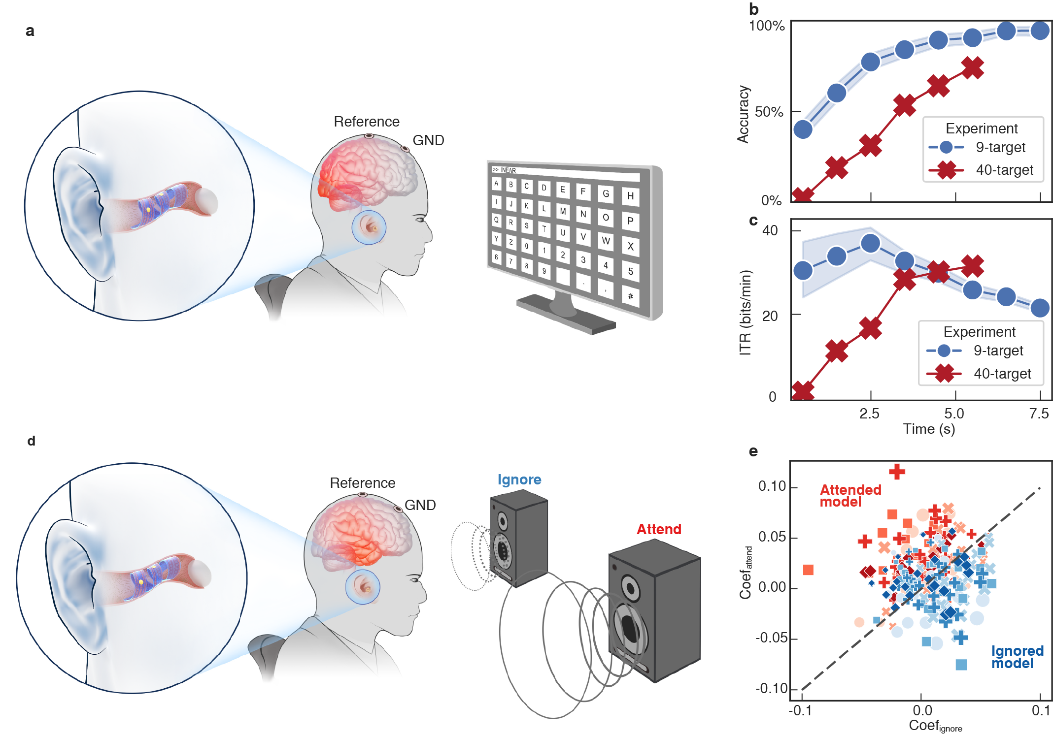 研究人员基于该器件分别开展了基于稳态视觉诱发电位的视觉BCI和基于鸡尾酒效应的听觉BCI研究,验证了器件在EEG-BCI中的独特优势,提升了BCI的易用性与泛用性,推动了可穿戴BCI的发展,为揭示自然场景下听觉注意机制带来重要的启示。