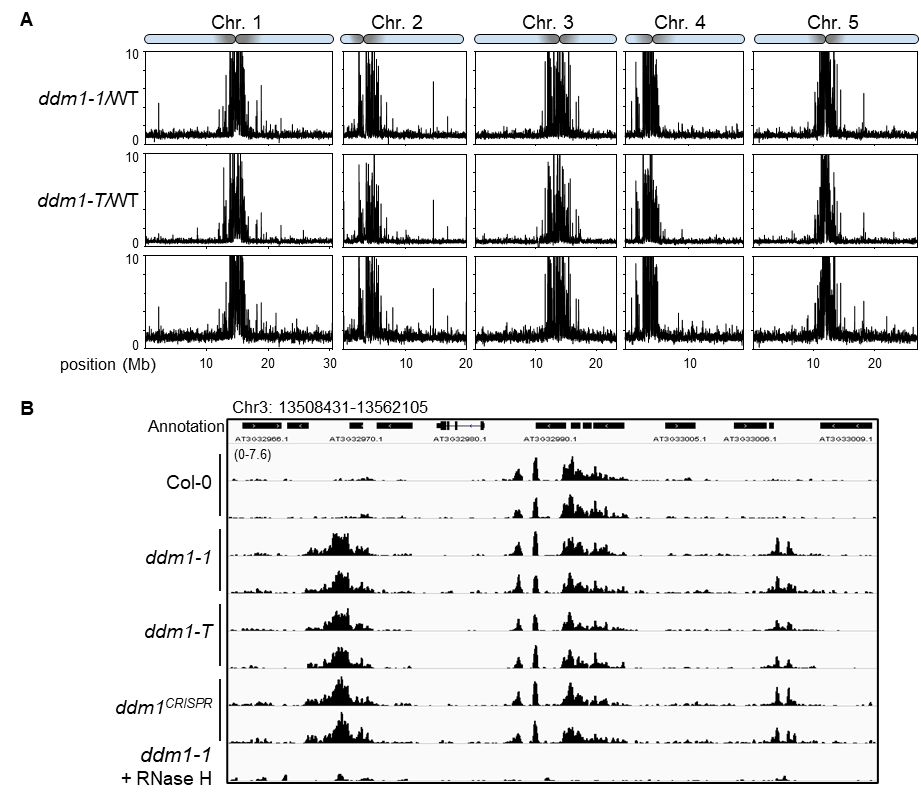 图1.DDM1突变导致着丝粒附近R-loop水平升高