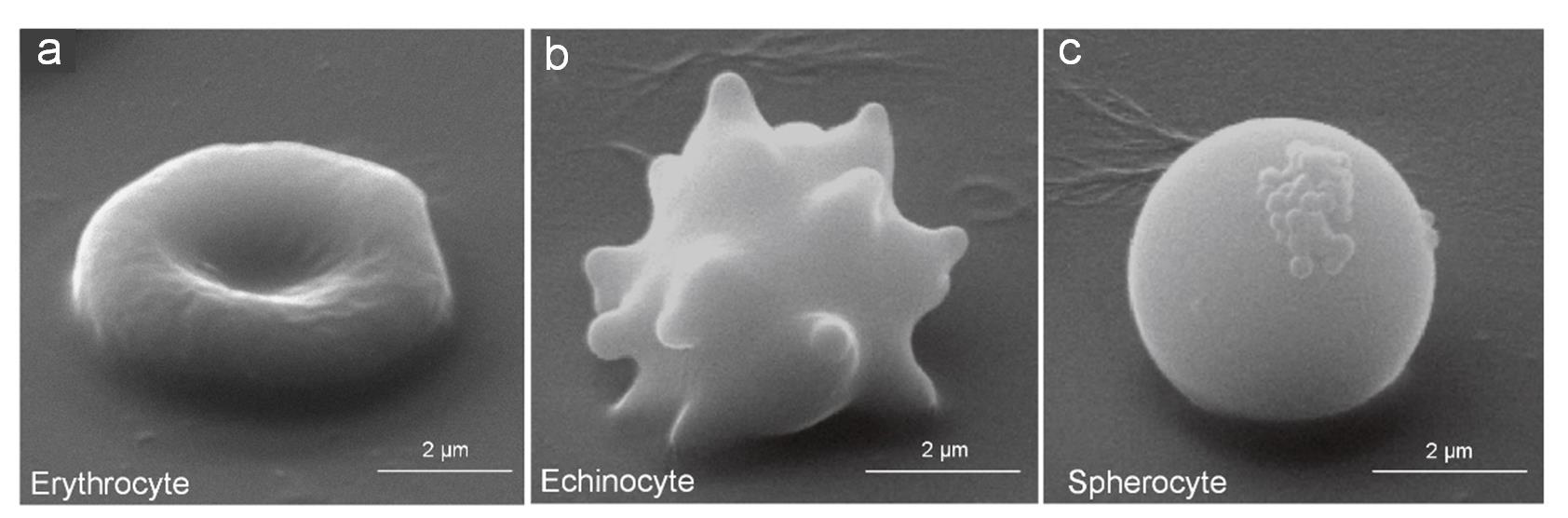 红细胞疲劳过程的典型形态(a)正常双凹红细胞(b)棘形红细胞(c)球形红细胞