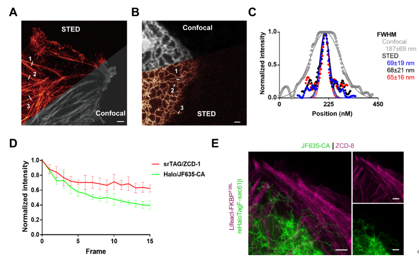 为了阐明srTAG在超分辨率成像中的作用,作者在表达Lifeact-FKBPF36L和融合Sec61 b的U2OS细胞中进行了活细胞STED成像(图3A,B),结果显示srTAG能够用于超分辨成像,并且能够将分辨率从共聚焦的200nm左右提升到70nm左右(图3C)。与HaloTag相比,srTAG在超分辨STED成像中表现出更好的光稳定性(图3D)。除此之外,srTAG能够与可逆标签reHaloTag兼容进行双色成像(图3E)。