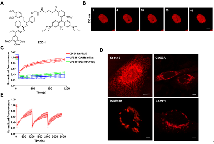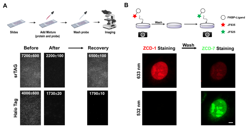 在该项工作的最后,研究人员猜测荧光信号的恢复可能是由于荧光团在蛋白质上的“开/关”平衡或非共价探针的可交换性。为了阐明其机制,首先纯化了重组FKBPF36L蛋白,并将FKBPF36L/ZCD-1复合物固定在盖玻片上。FRAP实验通过全内反射荧光(TIRF)显微镜进行监测。结果显示在没有自由扩散的ZCD-1的情况下观察到荧光的恢复,证实荧光团“在蛋白质上”的平衡有助于荧光的恢复。作为对照,纯化的Halo/JF635-CA复合物在光漂白后没有恢复荧光信号(图5A)。另一方面,为了研究探针交换是否也有助于FRAP现象,首先用ZCD-1孵育表达NLS-FKBPF36L的U2OS细胞,然后替换为含有ZCD-7的培养基。结果显示在532nm通道中出现荧光信号和在633nm通道中信号减弱,表明ZCD-1探针被ZCD-7交换(图5B)。
