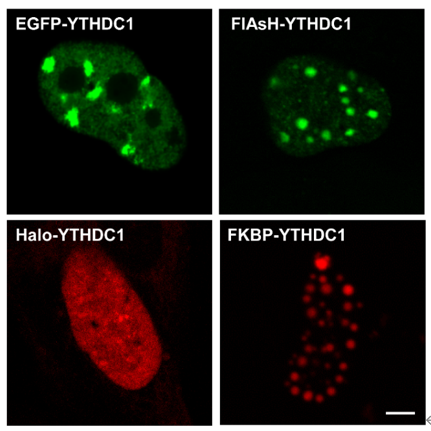 细胞核内的m6A识别蛋白YTHDC1会发生液-液相分离,在活细胞中以核点状分布。研究人员将YTHDC1与不同的标签融合,以检查标签大小是否会影响YTHDC1的分布。表达EGFP、FlAsH或FKBPF36L融合的YTHDC1的U2OS细胞表现为核点状(图4)。然而,Halo-YTHDC1的荧光信号在整个细胞核中扩散(图4)。
