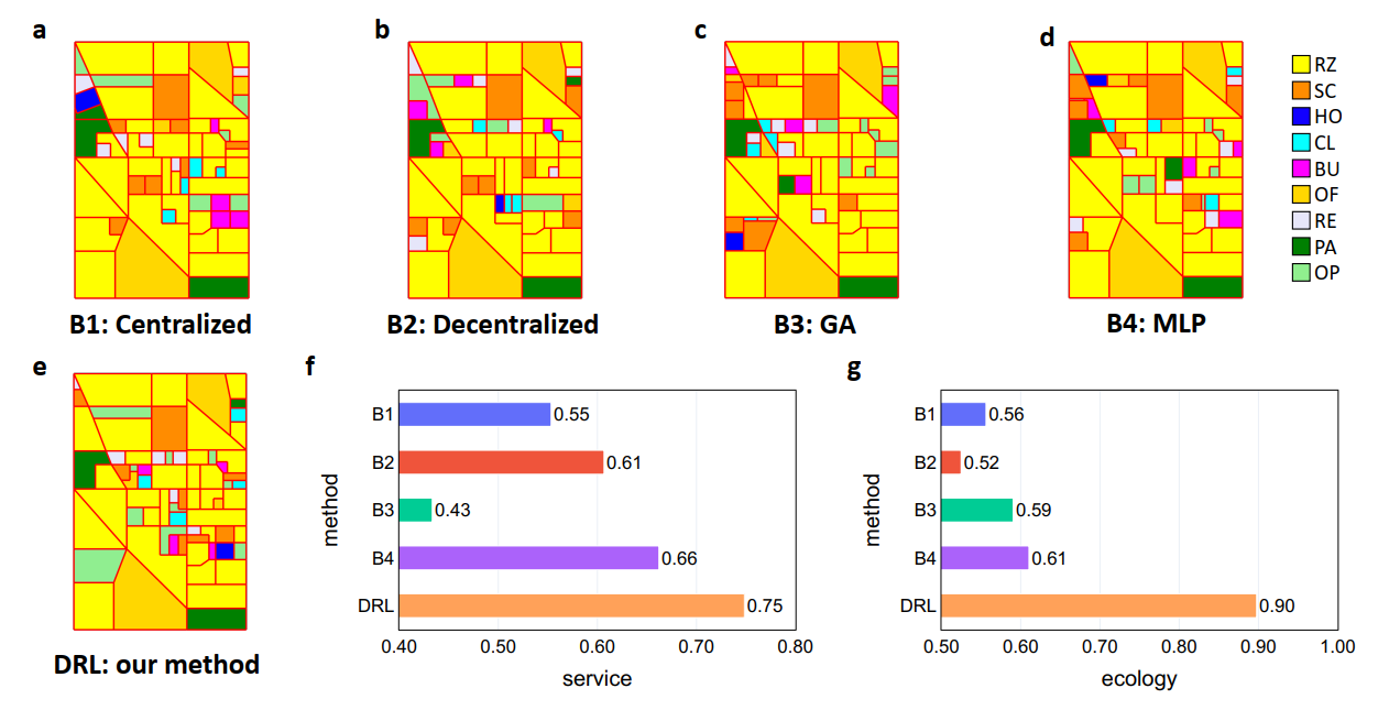 所提模型规划方案与已有算法性能对比(a-e)不同算法的规划方案:(a)中心化启发式方法,(b)去中心化启发式方法,(c)遗传算法,(d)多层感知机强化学习算法,(e)所提方法。(f-g)15分钟城市性能指标对比:(f)服务指标,(g)生态指标