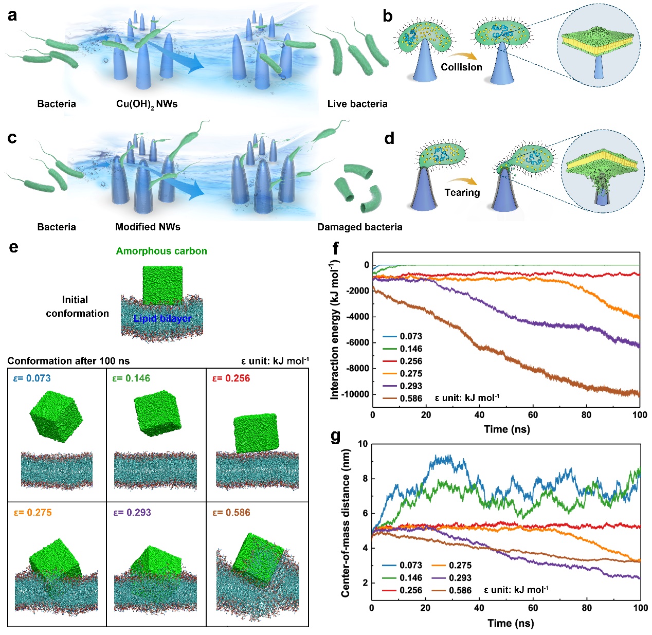 研究人员利用多孔泡沫铜制备了碳包覆纳米线,当受污染水样流经该材料时,即可对水中细菌造成严重的机械破损(图2)。结合流场计算、细菌机械强度测试以及细菌受力有限元模拟,证实碳包覆纳米尖端的瞬时粘附-流场撕扯效应能够突破细菌的临界应力,而水流冲击下细菌与纳米尖端发生的碰撞作用不能破坏细菌。