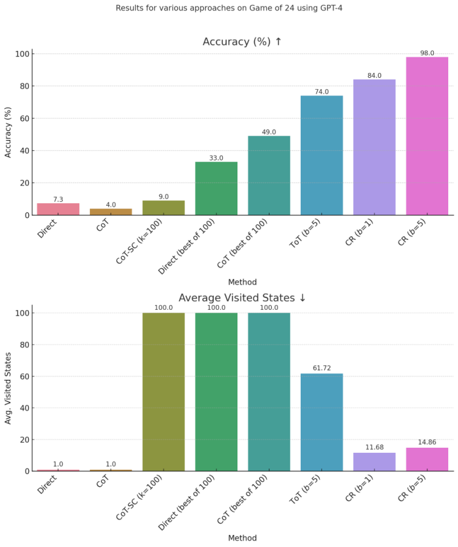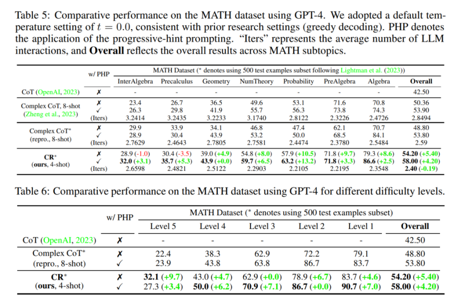 研究团队选择在FOLIO wiki和AutoTNLI、24点游戏、MATH数据集上对“累积推理”框架进行检验。结果表明,在FOLIO wiki和AutoTNLI数据集上“累积推理”框架始终优于现有方法,显示出高达9.3%的提升。特别是在校对后的FOLIO wiki curated数据集上,“累积推理”达到了98.04%的准确率。在围绕24点游戏的实验中,“累积推理”达到了98%的准确率。值得注意的是,与先前的最先进的方法ToT相比,这一数字有着高达24%的显著提升。MATH数据集的实验结果表明,“累积推理”算法在两种不同的实验设定下,均达到了超出当前已有算法的正确率。其中“累积推理”总体正确率可达58%,并在Level 5的难题中实现了42%的相对准确率提升,建立了GPT-4模型下的新SOTA。