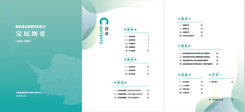 《纲要》从南极清洁能源利用的背景概述、发展目标、发展路径、关键技术、环境影响、队伍建设、技术推广等七个方面谋篇布局,提出发展并实现以安全可靠、绿色便捷、多能互补、韧性高效、智慧融合为重要特征的南极清洁能源系统,深入剖析了南极清洁能源系统装备、管控、运维等个性技术发展方向,研判了共性及未来技术发展趋势,提出了南极清洁能源利用关键技术路线,并在考虑环境影响的基础上制订了队伍规划和南极清洁能源利用技术推广思路。