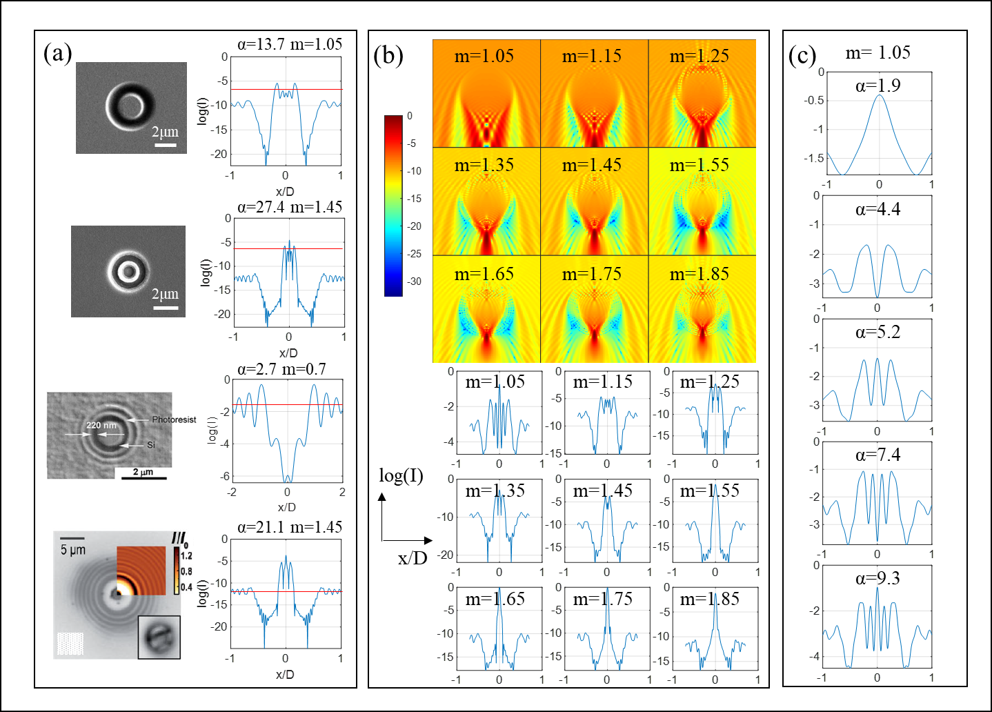 平面光通过微球后,在与微球相切的切面上的光强分布可以主要分为三个区域,包括峰值区、中间低谷区和外层平台区。其中,峰值区域具有形成亚波长微结构的能力,是最有可能实现纳米级加工的部分最值得关注的部分。为了在该区域获得多样化的形状,较低的归一化折射率是最关键的因素。当归一化直径增大时,中心峰值区的峰数也增加。然而,过大的尺寸会导致理论和实验之间的较大误差,并为曝光参数的控制带来困难,通常难以获得多个同心圆结构。