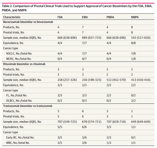 对比FDA、EMA、PMDA和NMPA批准肿瘤生物类似药的临床试验特征