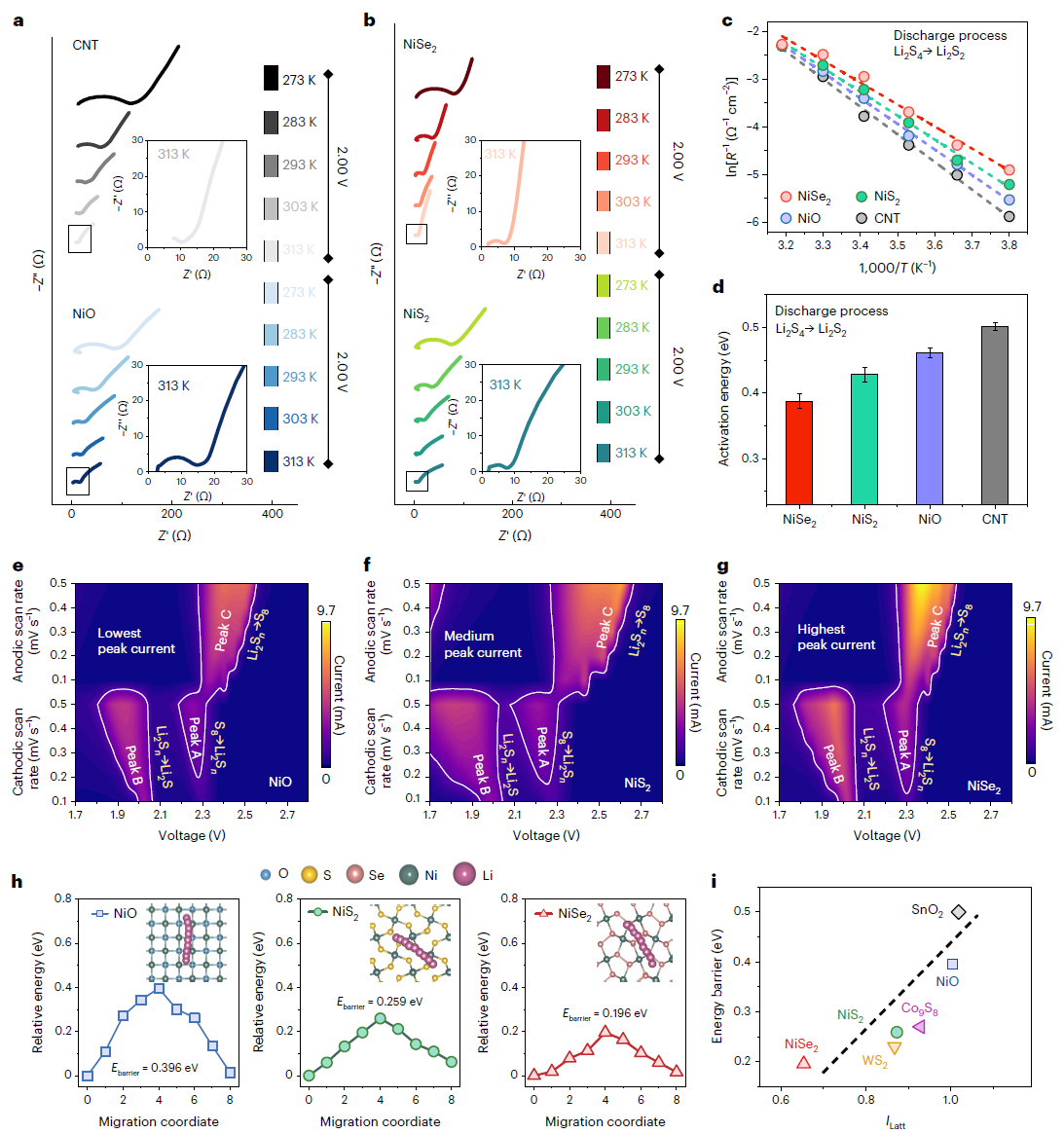 结合密度泛函理论计算与变温电化学阻抗谱、恒电位间歇滴定技术等电化学测试方法,研究人员验证了结构效应描述符的理论预测结果。ILatt较小的TMC催化剂造成吸附多硫化锂更明显的Li-S畸变,因而具有更低的活化能。