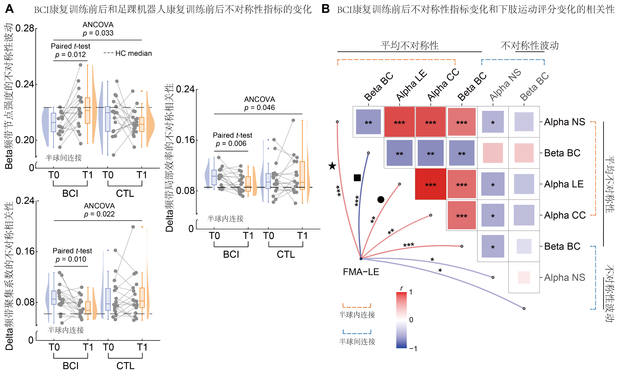 研究团队对比了两种康复策略(BCI主动康复 vs.机器人被动康复)的效果。虽然两种策略可以显著提高患者的下肢功能,但BCI组的改善显著优于机器人组。重要的是,研究人员发现基于BCI的主动康复引起卒中患者异常的脑不对称性向健康人的水平靠近,且BCI康复治疗前后不对称性指标的变化与下肢功能评分的变化显著相关。然而,机器人组没有表现出类似模式。神经可塑性被认为是脑损伤后功能改善的基础。该团队的结果表明不同的康复策略或可诱导不同的神经可塑性和功能重组模式。BCI康复训练时的主动神经参与可能引起大脑神经可塑性在个体中更加一致的变化,而在机器人组中则更加随机和个体化。卒中后大脑异常不对称模式的存在一定程度上反映了功能代偿,BCI闭环神经反馈促进受影响半球更大的生理募集,进而引起运动功能的改善,功能代偿随之减弱。