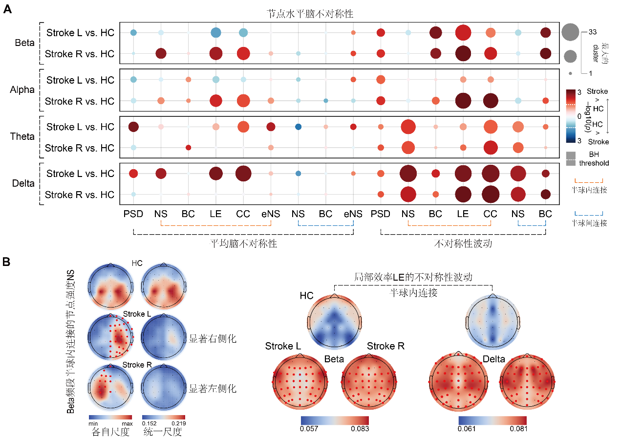 该团队揭示了卒中引起脑不对称性动态在各层级交互、各频带上的广泛的显著性改变(图2)。卒中患者的平均脑不对称性相对于健康人显著增强,且左右脑卒中患者表现出大致相反的模式,特别是在高频带。单侧卒中同时引起双侧半球的显著变化,平均不对称性的改变是双侧半球共同作用的结果。此外,研究人员发现卒中引起的脑各层级交互、各频带上的不对称性波动显著增强,并且在左右侧卒中人群中表现出相当一致的模式(由相似的区域驱动)。研究结果充分表明卒中对脑的破坏不是局域性的,而是对多层级交互、多频带、半球内和半球间连接上的广泛损害,打破了脑半球间正常的分离、整合平衡和相对稳定的不对称性动态。