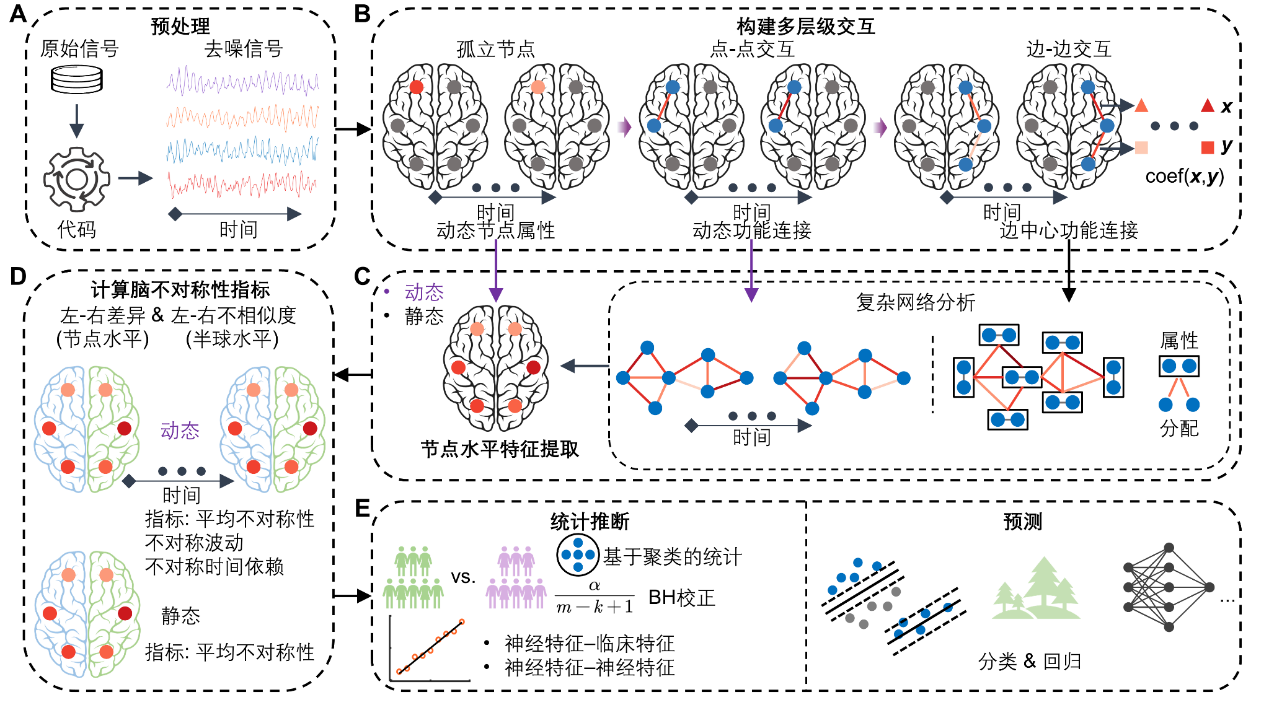 清华新闻网11月1日电 脑的不对称性或偏侧化是神经科学中长期关注的话题。脑的不对称性被认为有利于脑对不同任务的并行处理,是在进化过程中随着大脑体积的增大为避免半球之间过度的传导延迟的自然选择;而卒中等神经或精神疾病引起的脑不对称性的异常通常与功能损害相关。人体几乎所有复杂的行为都涉及脑的不同区域动态协调和多层级的交互。然而,目前对于脑多层级交互不对称性的研究缺乏系统性的分析方法。在临床上,卒中等脑损伤患者在进行康复训练和治疗后,可能会诱发大脑的可塑性变化。脑损伤后异常的不对称性模式随着功能康复如何变化是临床上关注的热点。