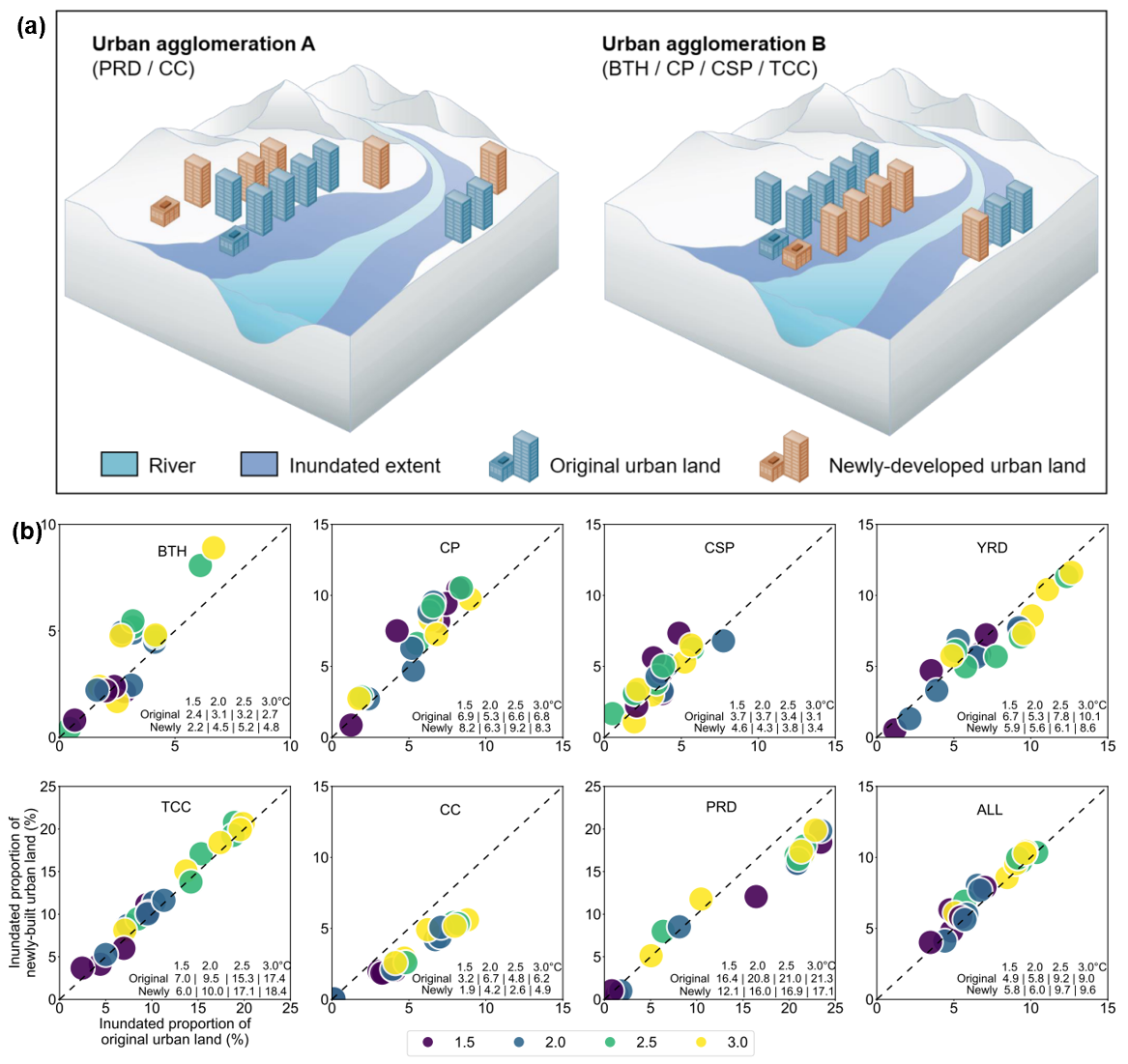 图2.已有和未来新建城市用地的被淹没情况。(a)不同城市扩张格局对已有和未来新建城市用地洪水风险的影响。(b)SSP5-8.5 情景下被淹没城市用地范围。x 轴表示未来被淹没的已有城市用地面积占已有城市用地总面积的比例,y 轴表示未来被淹没的新开发城市用地面积占新开发城市用地总面积的比例。点的颜色代表温升程度。每种颜色有五个点,代表五个气候模式的结果。右下角的数值代表基于五个全球气候模式预估得到的淹没比例的中位数