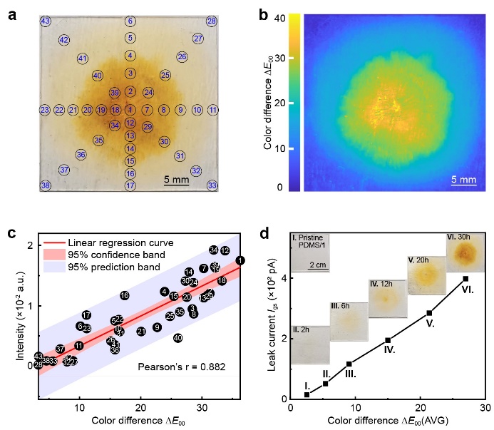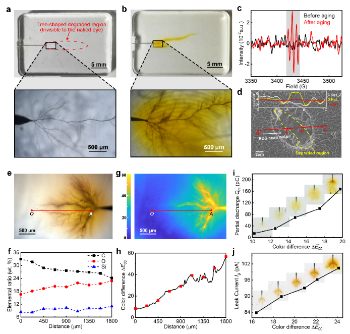 为了证明上述方法能够有效地应用于介电聚合物的电老化示警,课题组从自诊断聚合物复杂的电老化产物中识别并确定了指示剂受激变色后的化学结构,进而严格论证了电老化产生的氧自由基原位诱导指示剂变色的自诊断机理。课题组利用色差评价公式对变色前后的颜色差异进行量化,利用红外光谱表征材料的结构降解程度,利用泄漏电流和局部放电评估材料的性能损失,证明了颜色改变与电老化程度之间的定量关联关系。