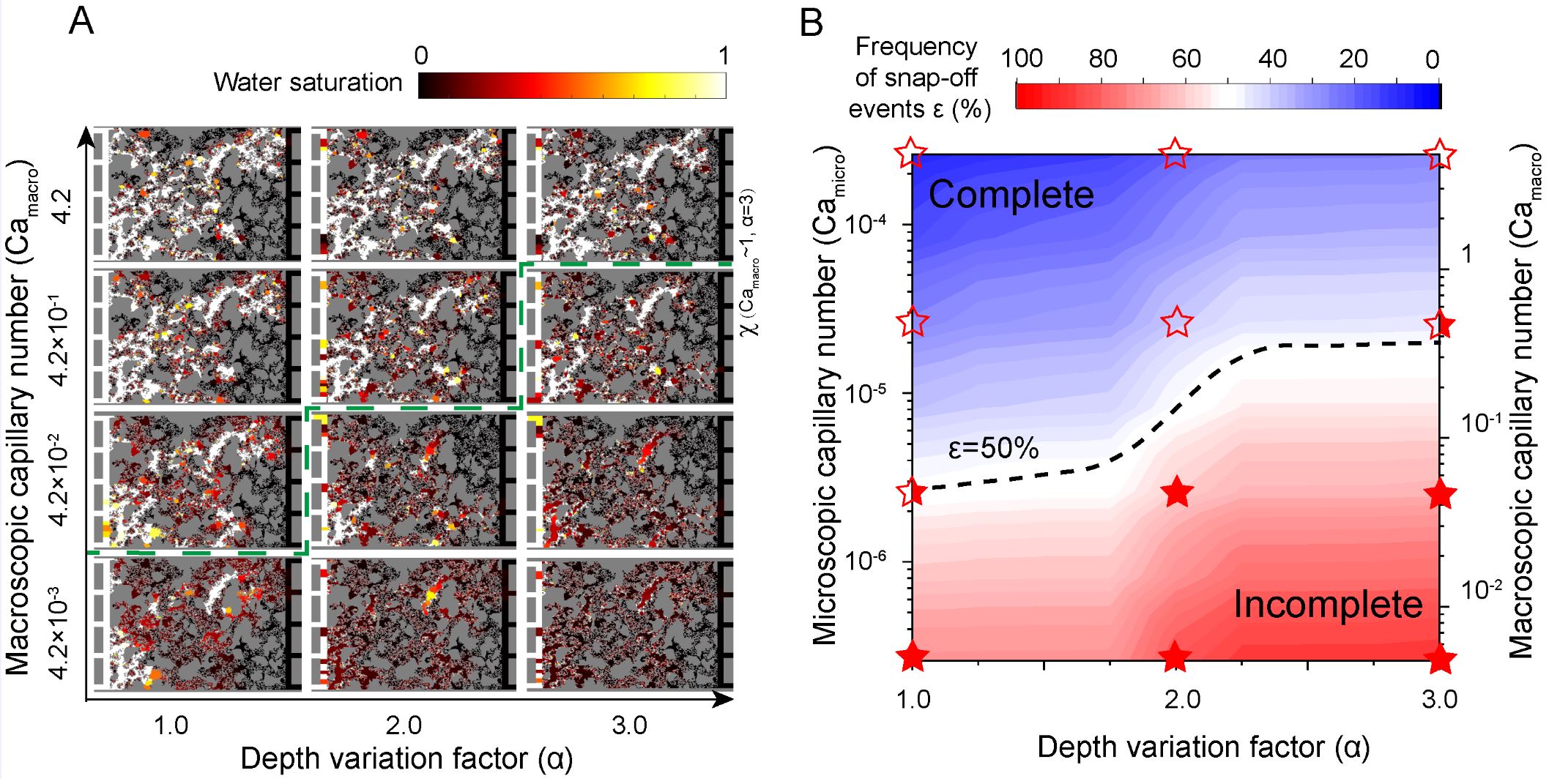图4.通过改进的动态孔隙网络模型和理论分析将孔隙尺度界面不稳定性与宏观渗吸模式联系起来。(A)通过将毛管数准则和卡断几何准则纳入孔隙尺度流动行为,采用改进的动态孔隙网络模型模拟的相图。(B)通过理论分析显示毛管数Ca与深度变化因子α之间关系的半对数图。虚线表示毛管数的分析预测临界值,这是基于微观卡断准则的宏观解。卡断频率等于50%可以区分完全和不完全的渗吸模式,黑色虚线是卡断频率等于50%的等高线。卡断频率的理论及实验值根据上述微观界面不稳定性准则计算得到。针对多孔介质中的所有孔喉,可以预测完整和不完整渗吸区域。星号符号是微流控实验得到的结果,其中填充、半填充和空心符号分别代表不完全渗吸、过渡态和完全渗吸的模式