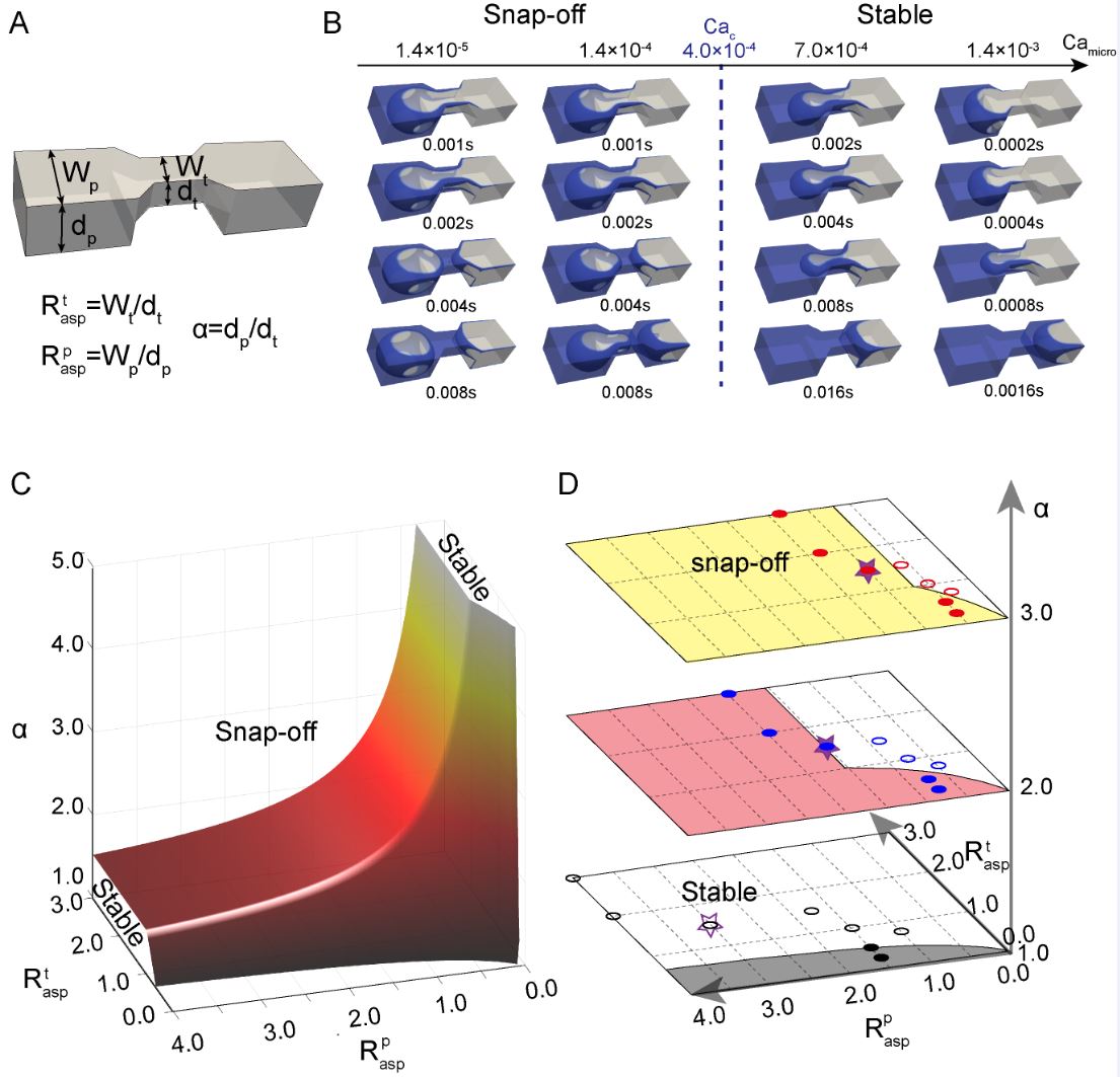 图3.孔隙尺度相图显示了稳定和不稳定的界面事件。(A)孔喉结构和三个无量纲数(孔喉的宽深比及深度变化因子)示意图。(B)验证卡断现象的临界毛管数。在强自吸作用下,毛管数将影响前体润湿膜在角部相对于主弯液面前进的相对速度。(C)基于理论分析的三个无量纲数空间中卡断现象的几何准则;颜色图表示深度变化因子的值。(D)不同几何约束下稳定和不稳定卡断事件的模拟和实验数据切片。圆形和星形符号分别是数值模拟和微流控实验的结果,其中实心和空心符号分别代表不稳定的卡断现象和稳定状态