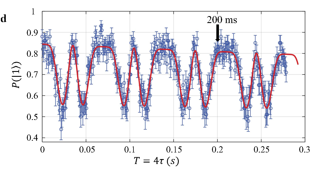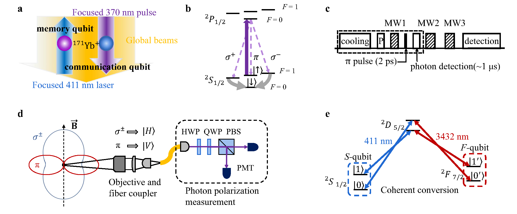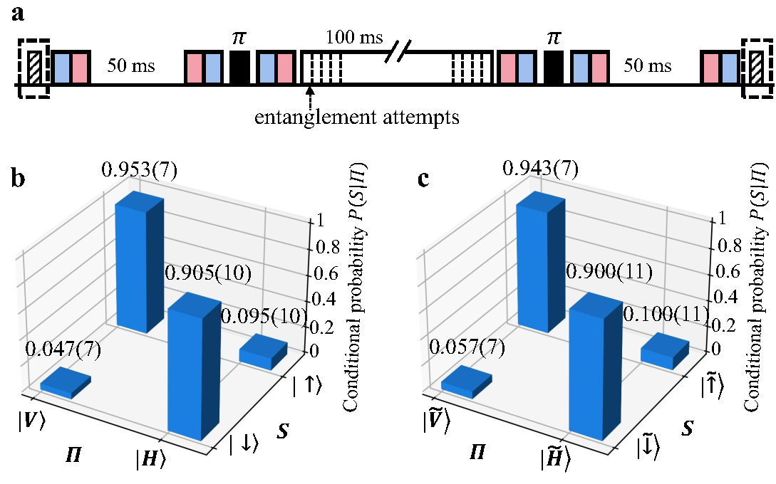 为了克服上述困难,课题组提出使用同种离子的双类型量子比特实现量子网络结点的方案。该方案利用同种离子的两对超精细结构能级分别编码通讯比特和存储比特(S-比特和F-比特),并利用411nm和3432nm的双色窄线宽激光实现了两种量子比特之间微秒量级的相干转换。一方面,研究人员演示了利用S-比特在数百毫秒的时间尺度内生成离子-光子纠缠;另一方面,研究人员通过自旋回波方法延长F-比特的存储寿命,实现相干时间达到秒量级的存储量子比特。通过比较有无离子-光子纠缠生成操作时存储比特的保真度变化,研究人员证实了两种量子比特之间低于实验精度的串扰误差,从而实现了无串扰的量子网络节点。相较于之前采用不同种类离子的方案,该方案极大简化了实验系统,向着未来量子计算机和量子网络的模块化迈出了重要一步。