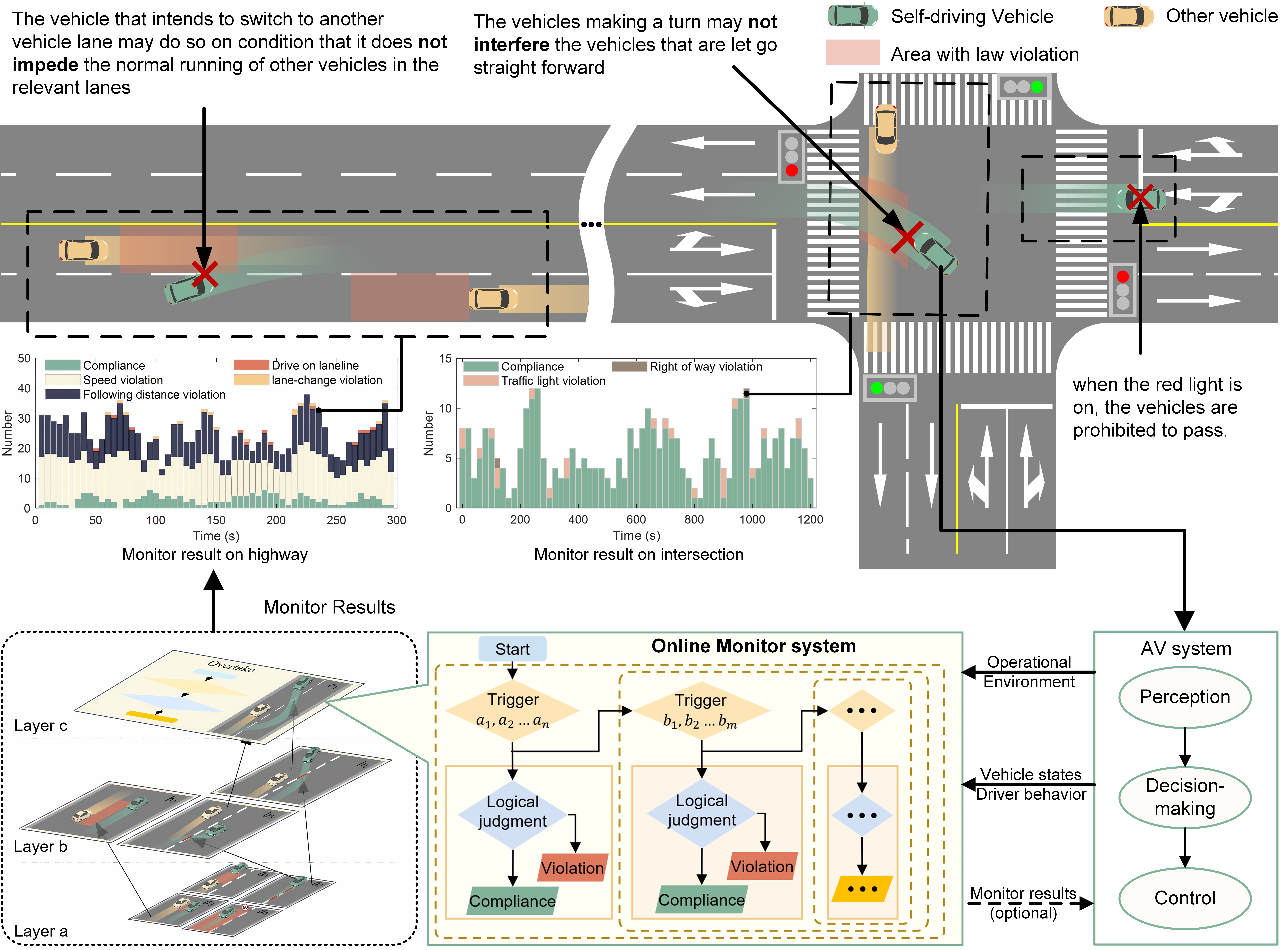 为解决这一问题,研究团队提出了自动驾驶“合规性在线监测”技术,该技术所构建的系统独立运行于自动驾驶系统,通过获取自动驾驶汽车行为信息来判断车辆行为是否合规。该技术提出了一套道路交通法规数字化方式和基于触发的分层合规性在线监测架构,该架构通过设置触发条件保证不同法规条例在恰当的运行环境下触发,并且方便扩充及容纳数字化后的不同地域驾驶经验及规则;同时,还提出了“No Crash”和“No Change”的合规性模糊阈值选取准则,通过数据集分析了人类驾驶员在面对模糊法规时的行为分布,并基于准则选取了符合人类驾驶员行为的合规性阈值。