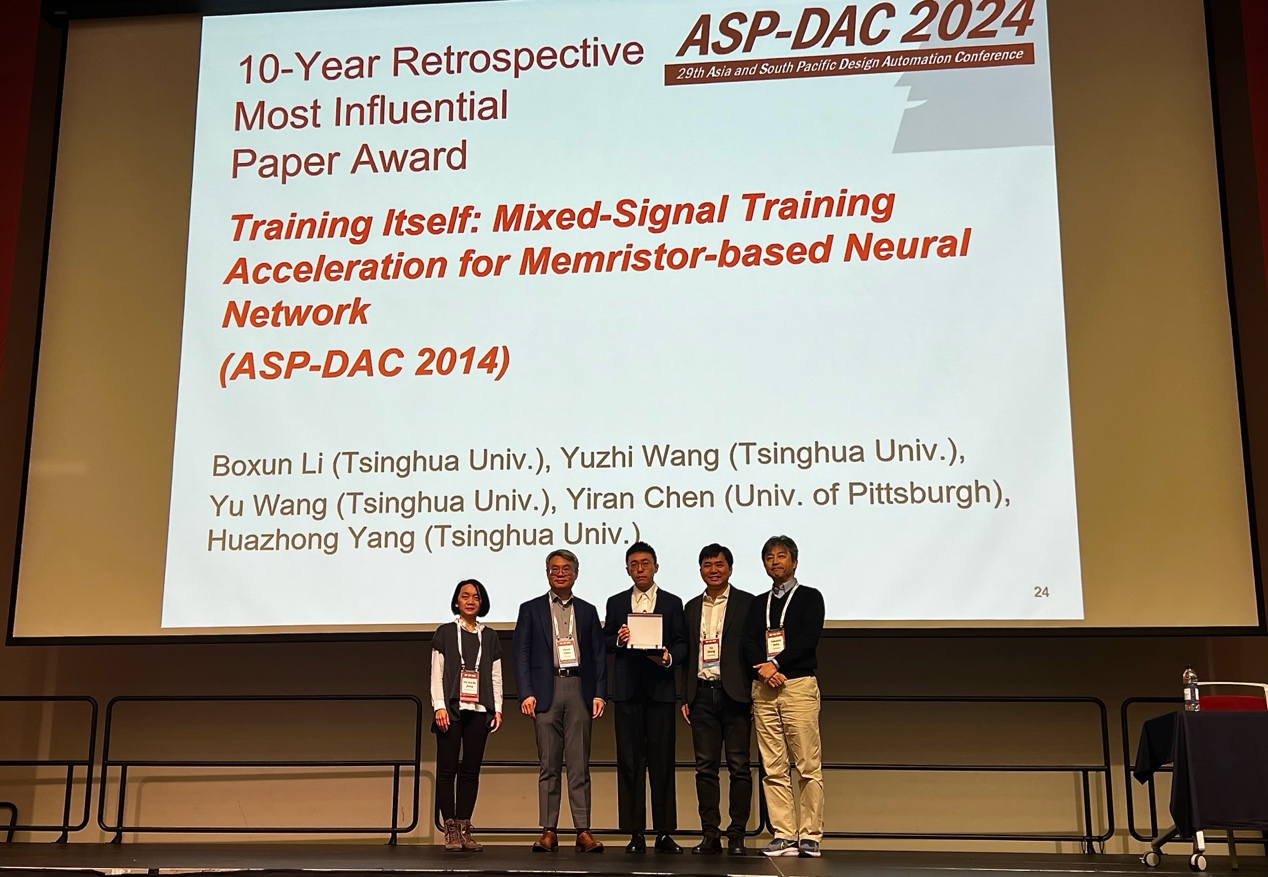 清华新闻网1月30日电 1月22日至25日,由国际电气电子工程师学会(IEEE)主办的2024年亚洲及南太平洋设计自动化会议(IEEE ASP-DAC 2024)在韩国仁川举行,全球设计自动化领域的400余位研究者参会。清华大学电子工程系教授杨华中、汪玉于2014年发表在ASP-DAC会议的论文“自训练:面向基于忆阻器神经网络加速器的混合信号训练加速”(Train Itself:Mixed-Signal Training Acceleration for Memristor-based Neural Network)荣获该会议十年回顾最具影响力论文奖。