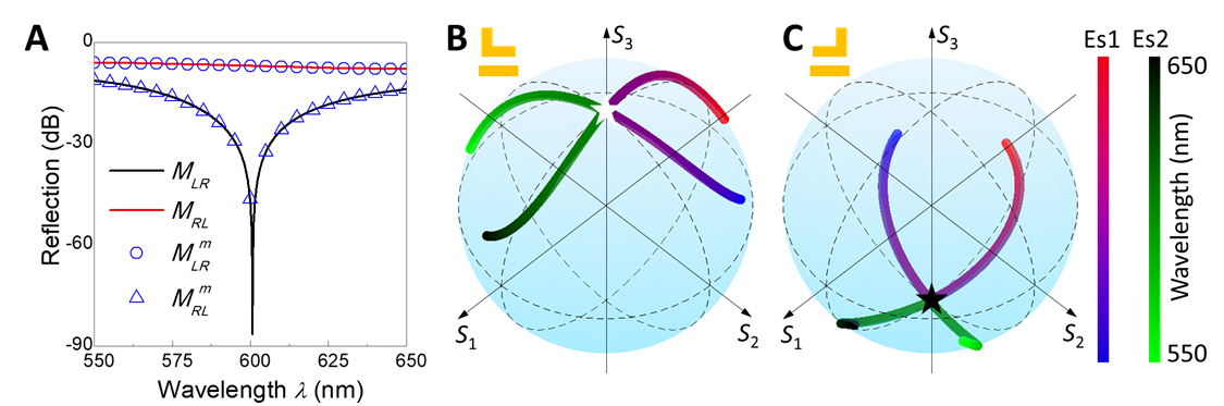 图3:具有镜像对称结构的双奇异点的仿真结果。(A)反射光谱的偏振选择性。在λ = 600nm处可观察到结构S与Sm分别对应的两个与的两个反射零点。(B)超表面S与(C)超表面Sm的本征态与波长的关系在庞加莱球上的投影。表明它们在λ = 600nm处在两个极点(RCP和LCP)简并。其中Es1与Es2代表两个本征态。