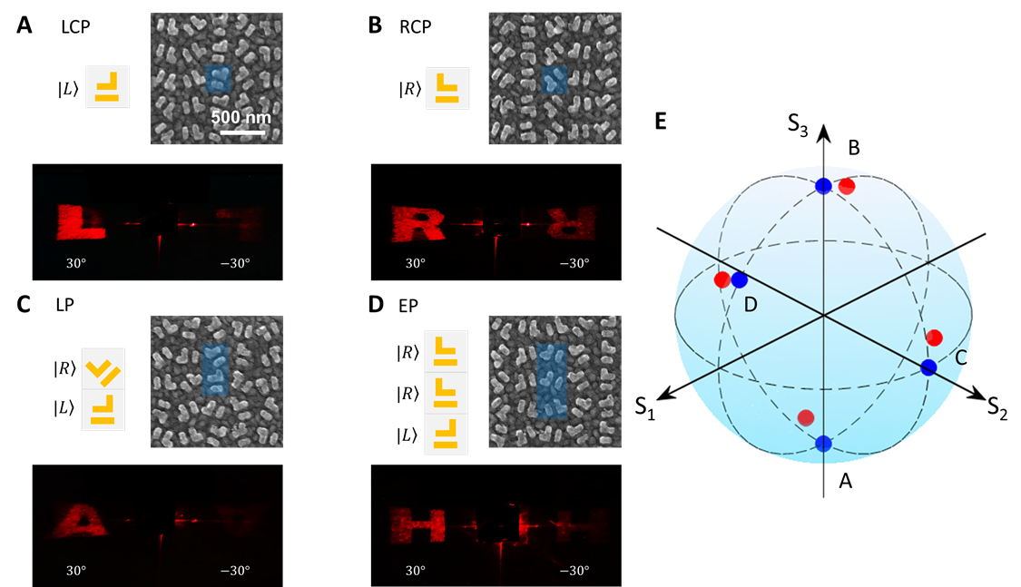 图4:具有不同偏振设计的不对称超全息图的制作与测量结果。全息图的偏振设计分别为(A)左旋LCP (χ = -45°);(B) 右旋 RCP(χ = 45°);(C)线偏LP-45° (ψ = 45°,χ = 0°)和(D)椭偏ELP (ψ = 0°, χ = 18.43°)。非对称全息图像在30°时可以看到清晰的“L”、“R”、“A”和“H”图像,但在对角-30°时仅出现模糊且不完整的图像。(E)全息图像对应偏振在庞加莱球上的投影。 蓝点:设计的偏振。 红点:实验测量的偏振。
