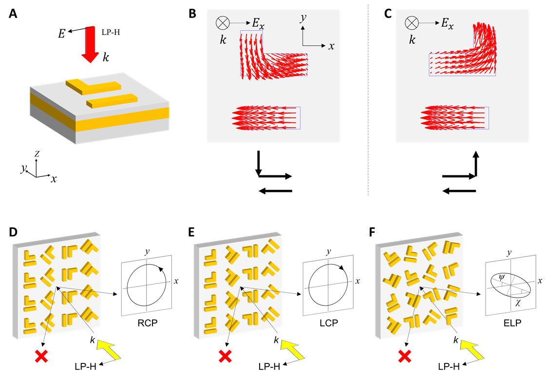 图2:双奇异点拓扑矢量超表面的设计原理。(A) 结构单元示意图,水平线偏振光沿-z方向垂直入射超表面。(B)单元结构S与(C)其镜像对称结构Sm在x方向线偏振入射时的表面电流分布的仿真图。(D-F)通过结合EP和PB相位梯度分布,出射光只往右侧偏折,实现左右非对称波前调制。其中(D)单元结构S只适用于右旋光(RCP)。(E)Sm只适用于左旋光(LCP)。(F)通过叠加S和Sm,可以对出射光的偏振态进行任意控制。