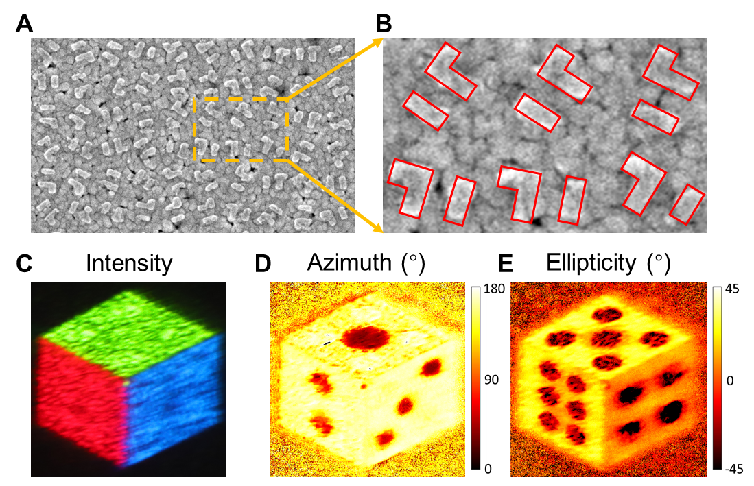 图6:不对称全彩矢量全息图测量结果。(A)制备的超表面的 SEM 图像和(B)其局部放大图像。(C)测量的30°方向区域的强度、(D)方位角和(E)椭偏率。