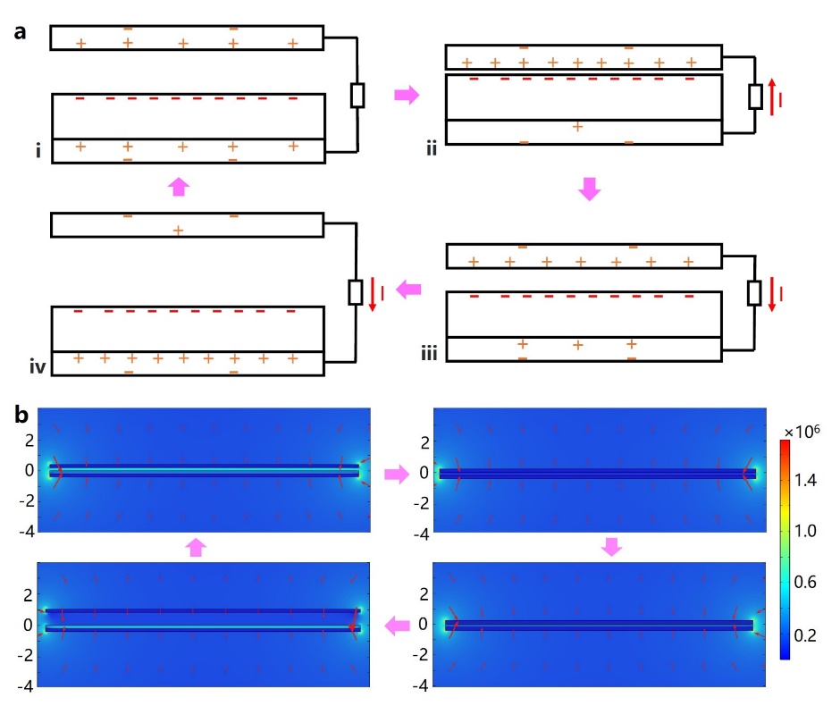 图4.接触分离式TENG工作原理示意图与仿真