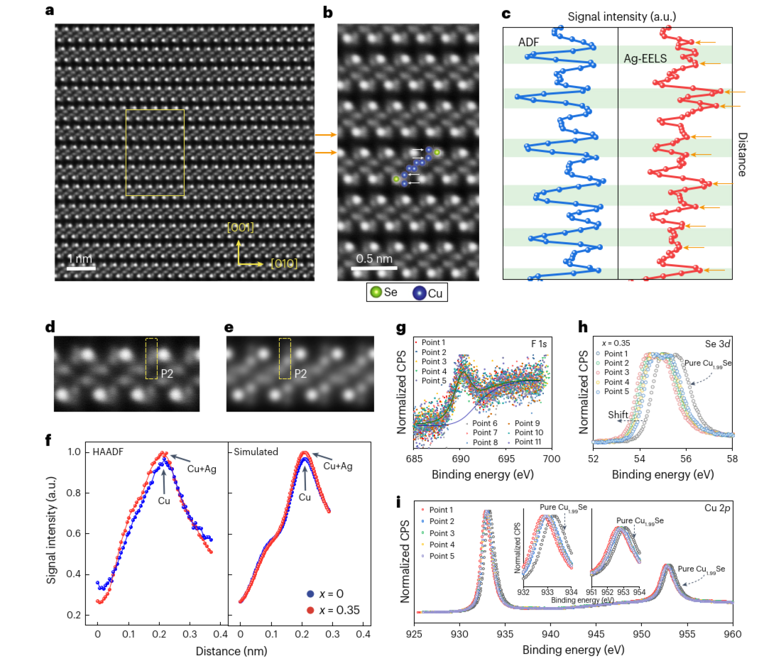 为了突破这一难题,清华大学材料学院李敬锋教授课题组与朱静院士课题组开展合作,先后在Cu2Se的晶体结构表征及其热电性能提升机理研究等方面取得一系列研究进展。在前期工作的基础上,研究团队提出利用阴阳离子共掺杂,通过增强元素电负性差异及空间障碍作用,从而提高铜离子激活能以抑制其长程迁移的新思路(图1)。发现在Cu2Se中掺入少量氟化物(AgSbF6)既能显著改善材料稳定性,又能显著提高热电性能,热电优值(ZT值)突破该材料体系的最高值,达到3.0(1050K),其热电模块的实测转换效率达到13.4%,并经120次循环仍没有出现明显的性能劣化(图2)。团队利用先进电子显微学方法和X射线光电子能谱确认了阴(F-)、阳(Ag+)离子的共掺杂(图3),占据Cu位的大尺寸Ag离子结合增强的Cu-F键能可以显著抑制Cu离子长程迁移及电离,从而有效提升材料的稳定性。