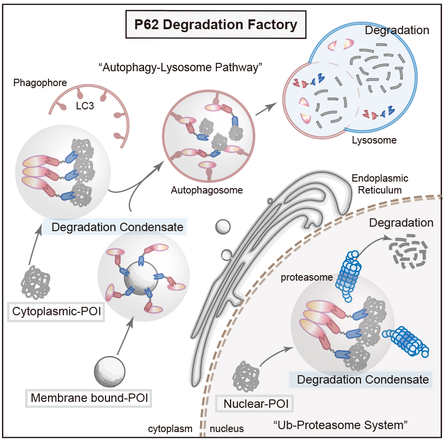 随着“液-液相分离”领域的蓬勃发展,越来越多的研究表明,在降解过程中的关键蛋白会通过液-液相分离形成降解凝聚体,这些凝聚体扮演着“降解工厂”的角色,将与降解相关的功能蛋白及待降解的底物富集在局部区室中,从而高效发挥降解功能。其中最具代表性的降解凝聚体是自噬受体蛋白p62与多聚泛素链形成的p62小体,它们为隔离膜的附着和延伸提供支点,并启动随后的自噬进程(图1)。此外,p62还参与到泛素-蛋白酶体相关的降解凝聚体中,成为蛋白酶体和自噬途径之间的桥梁。如果能特异性地将蛋白靶点招募至这些降解凝聚体中,将可能摆脱酶促反应的催化步骤(例如E3泛素连接酶的催化反应),直接通过空间距离的拉近实现有效降解。