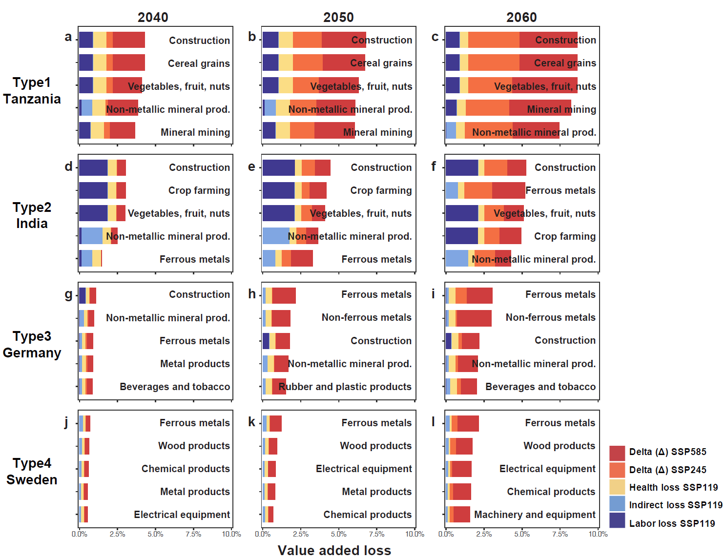 图2.气候变化情景下全球不同区域的“非平行”风险暴露。a-c,SSP119情景下健康损失(a),劳动生产率损失(b)和间接损失(c)最严重的10个经济体。d-f为SSP585情景