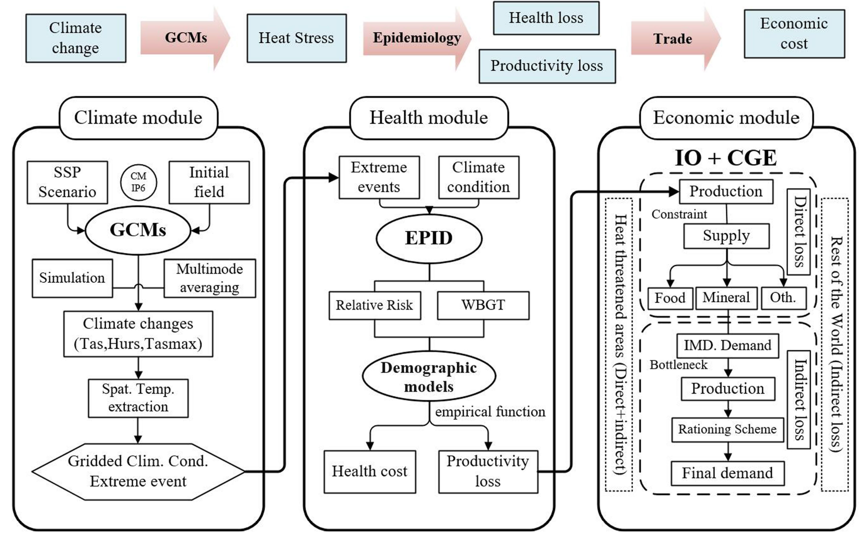 近日,清华大学地球系统科学系(以下简称“地学系”)关大博教授团队突破地球系统模式与社会经济耦合的壁垒,通过构建“气候-健康-经济”子系统有机连接的交叉学科灾害足迹模型,在网格尺度对气候变化下的全球热浪健康风险及经济损失进行了评估。研究团队集成14组第六次国际耦合模式比较计划(CMIP6)气候情景数据集,量化了在未来不同共享社会经济发展路径(Shared Socioeconomic Pathways, SSP)下因气候变暖造成的生命健康损失(极端热浪导致的超额死亡人数的统计生命价值)、劳动生产率损失(高温暴露导致的劳动时间和生产力损失)和价值链中断损失(供给或需求失衡导致的生产停滞造成的损失)。研究通过深入剖析气候变化对全球价值链的影响机理,精准识别并重点分析了脆弱国家和关键产业的气候风险,为我国开展气候适应和风险防控提供了决策参考,也为全球开展靶向性、协同性气候治理提供了科学依据。