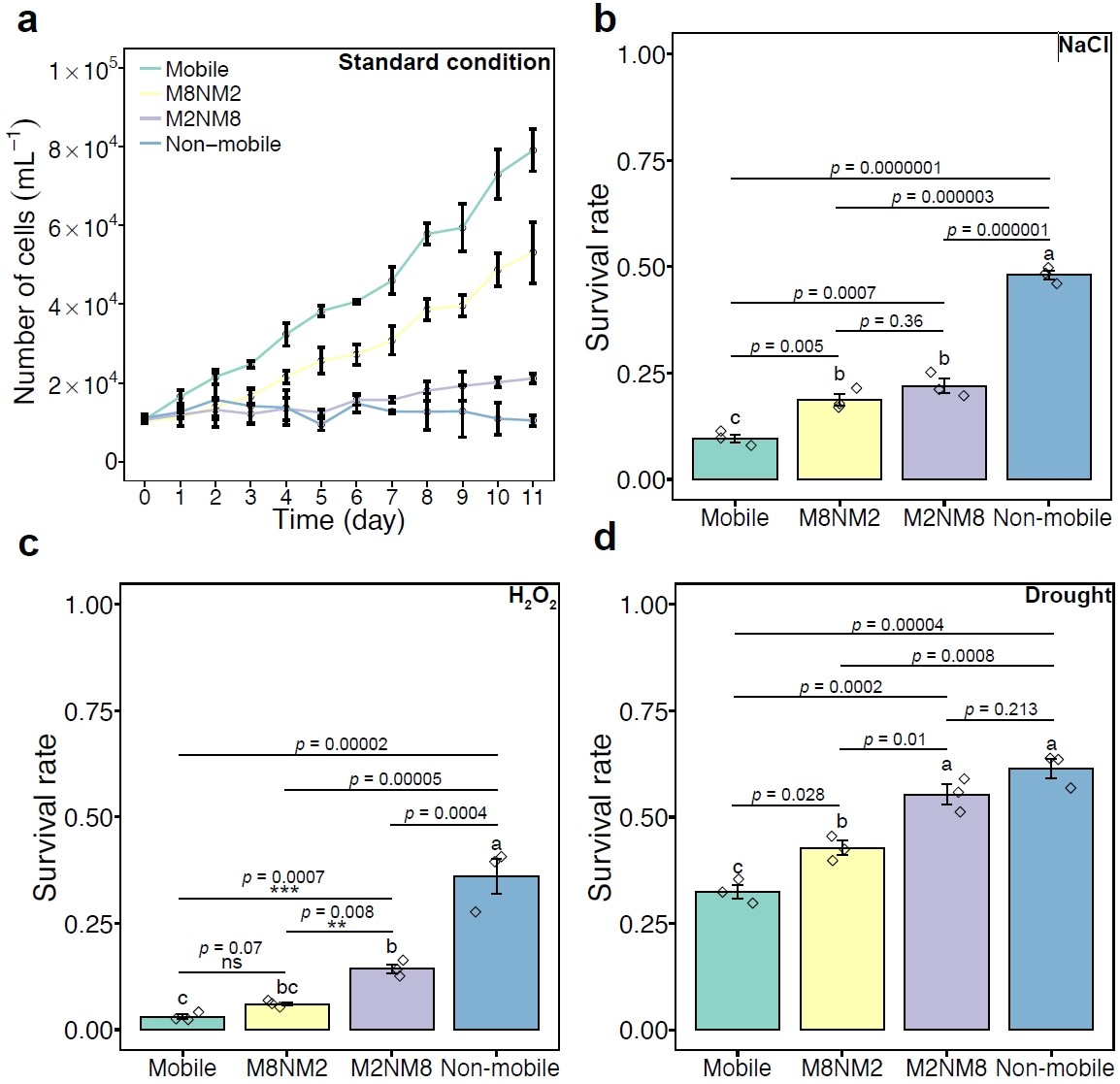 图2.表型组成受控的雨生红球藻种群在正常和压力条件下的适应性相关参数