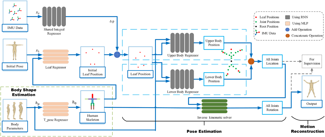 针对以上问题,清华大学机械系智能制造与精密加工研究室研究人员提出了一种基于六个惯性传感器的新算法结构FIP(Fast Inertial Poser),为便携式终端的部署带来了一种新的思路。该方法分为两个阶段,关节位置估计和运动学逆解。与之前的方法相比,该方法效率提升的主要原因为:第一,消除了额外的优化设计;第二,基于“最小测量原则”,通过考虑人体形状参数(身高、腿长、单臂长)和性别,使用运动学逆求解器和不同传感器的共享模型来增强神经网络结构的表达能力;第三,去除RNN的双向传播机制。在位置估计阶段,FIP使用三个独立的循环神经网络(RNN)来估计叶节点和其余节点的位置。为了使模型推理过程更接近真实的物理过程,FIP使用传感器共享积分RNN来估计叶节点的位置。此外,对于每个RNN,人体参数信息通过嵌入式编码的方式输入到算法网络中。