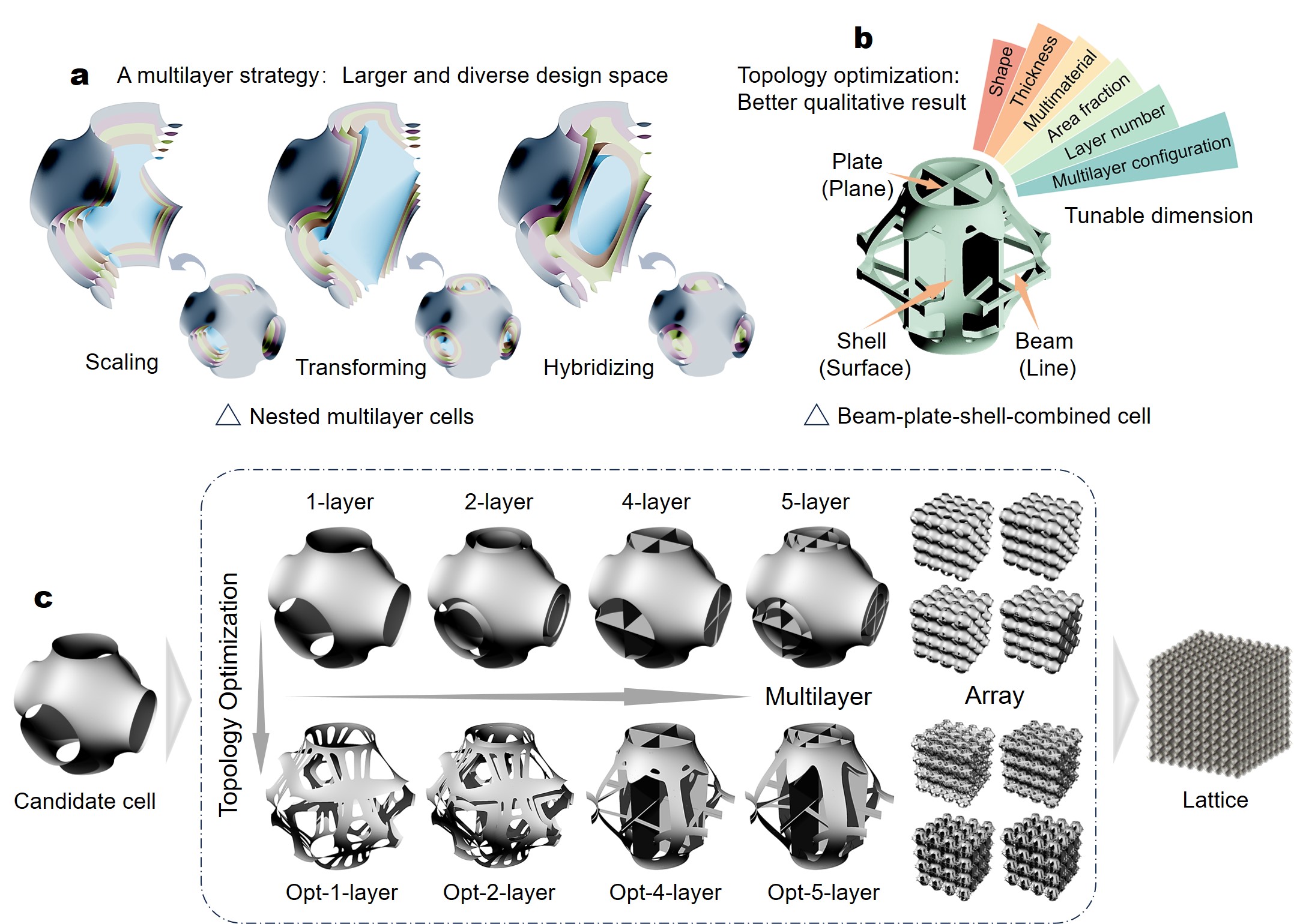 图1.用于壳系点阵超材料的多层策略和拓扑优化相结合的优化设计方式