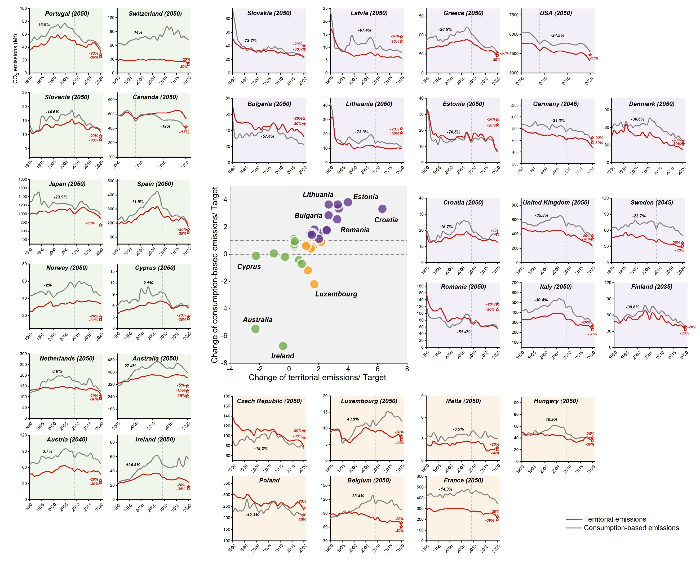 研究重点关注了实际排放模式与COP15目标之间的差距。在《联合国气候变化框架公约》系列缔约方大会上,各国减排目标均基于生产端排放制订。在实现减排目标的过程中,被称为“碳泄漏”或“碳转移”的排放“外包行为”日益引起环境政策制定者的关注。为解决潜在的排放泄漏问题,本研究在分析生产端碳排放的同时,也深入探讨了基于消费的碳排放情况(Consumption-based Emissions)。在34个发达国家中,有15个国家成功实现了减排目标,而12个国家未实现其减排承诺。此外,有7个国家的生产端排放达到了减排目标,但却通过贸易活动将部分排放转移至其他国家。