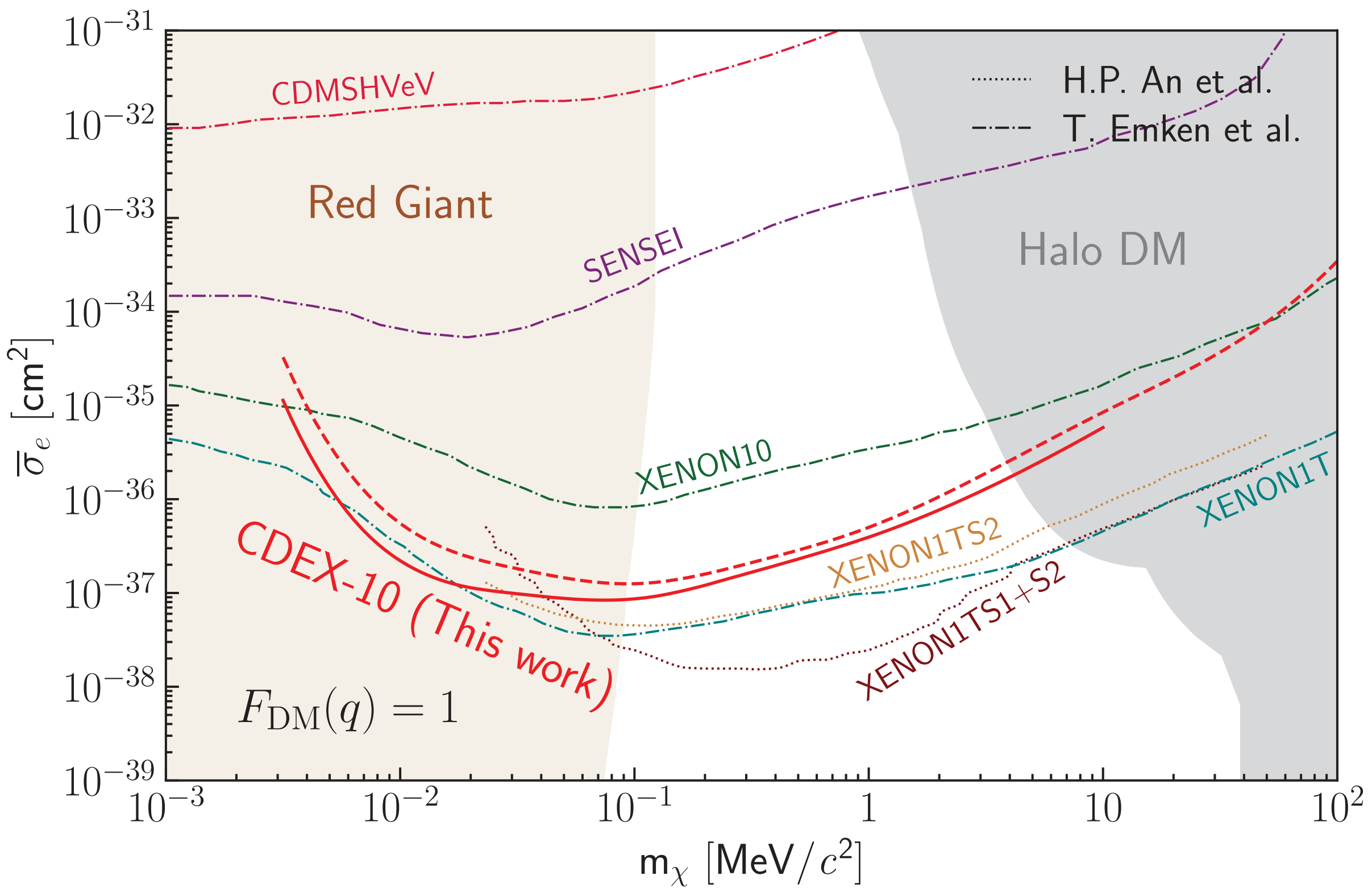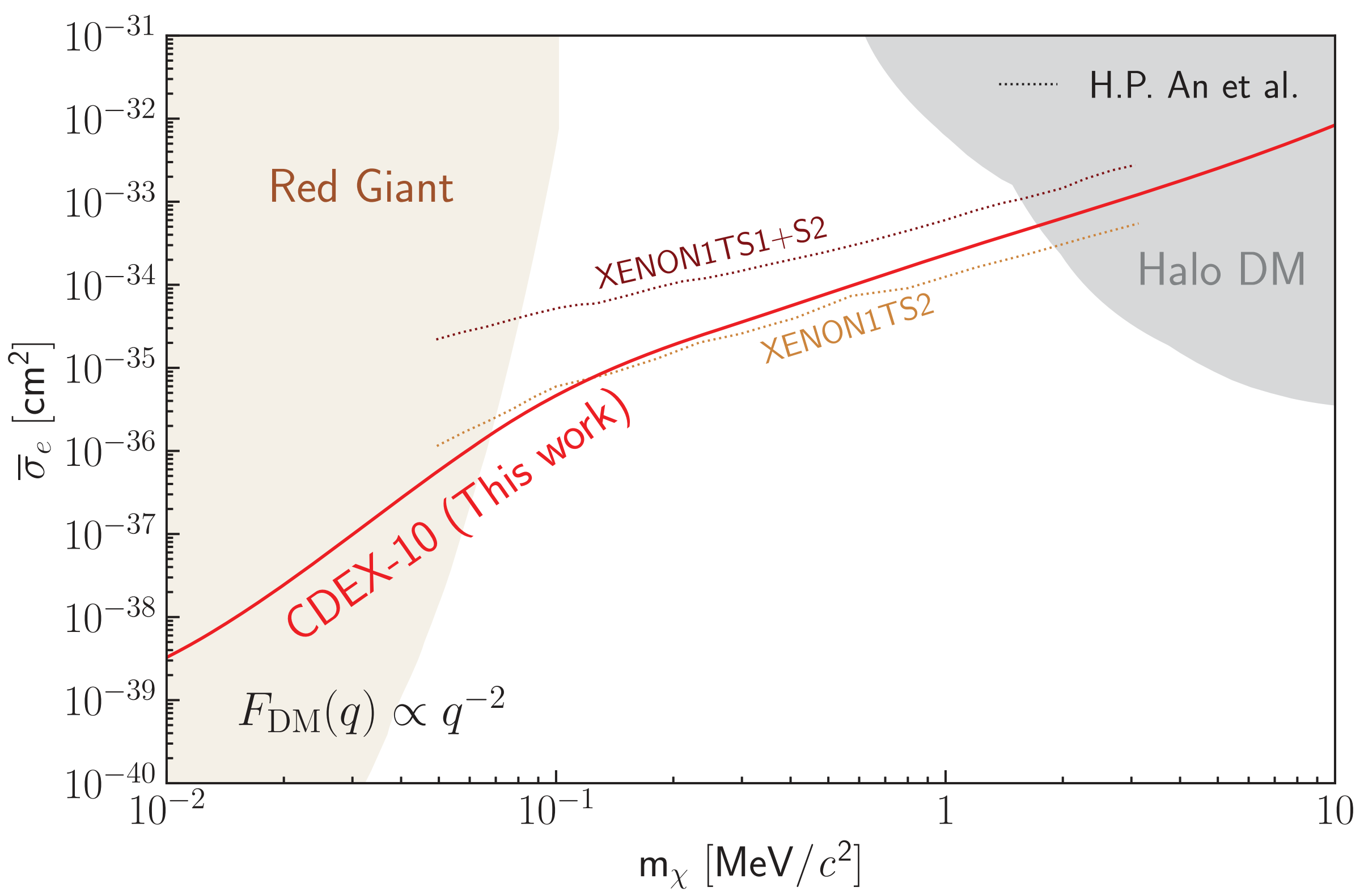 对轻质量暗物质进行探测的一个重要手段是开展暗物质-电子相互作用分析,电子由于质量更低,能够更高效地从轻质量暗物质粒子中获得能量,因此研究探测器内暗物质与电子的相互作用,能够显著提高探测器对轻质量暗物质的灵敏度。CDEX合作组在2022年使用一种结合了密度泛函理论(DFT)计算与半解析方法的暗物质-电子相互作用计算方法,基于高纯锗探测器对暗物质-电子相互作用进行了分析,并取得了国际领先结果,相关成果发表在《物理评论快报》(Phys. Rev. Lett. 129. 221301, 2022)。