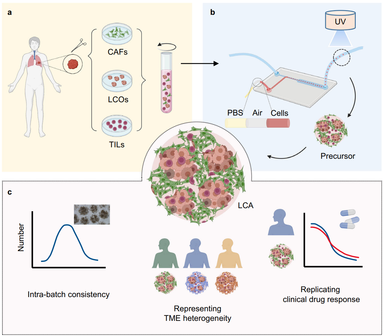 研究团队开发了基于微量上样策略的液滴微流控技术和具有良好原代细胞生物相容性的水凝胶材料,解决了多种原代细胞共培养活性维持的关键问题,通过将肺癌患者来源的肺癌类器官(LCOs)和多种肿瘤微环境细胞包埋于水凝胶材料中,经流体剪切、光固化成型和快速培养形成类组装体模型(LCAs)。该技术可以对临床穿刺样本来源的微量细胞进行精准上样控制,类组装体模型可以直接冻存和复苏。