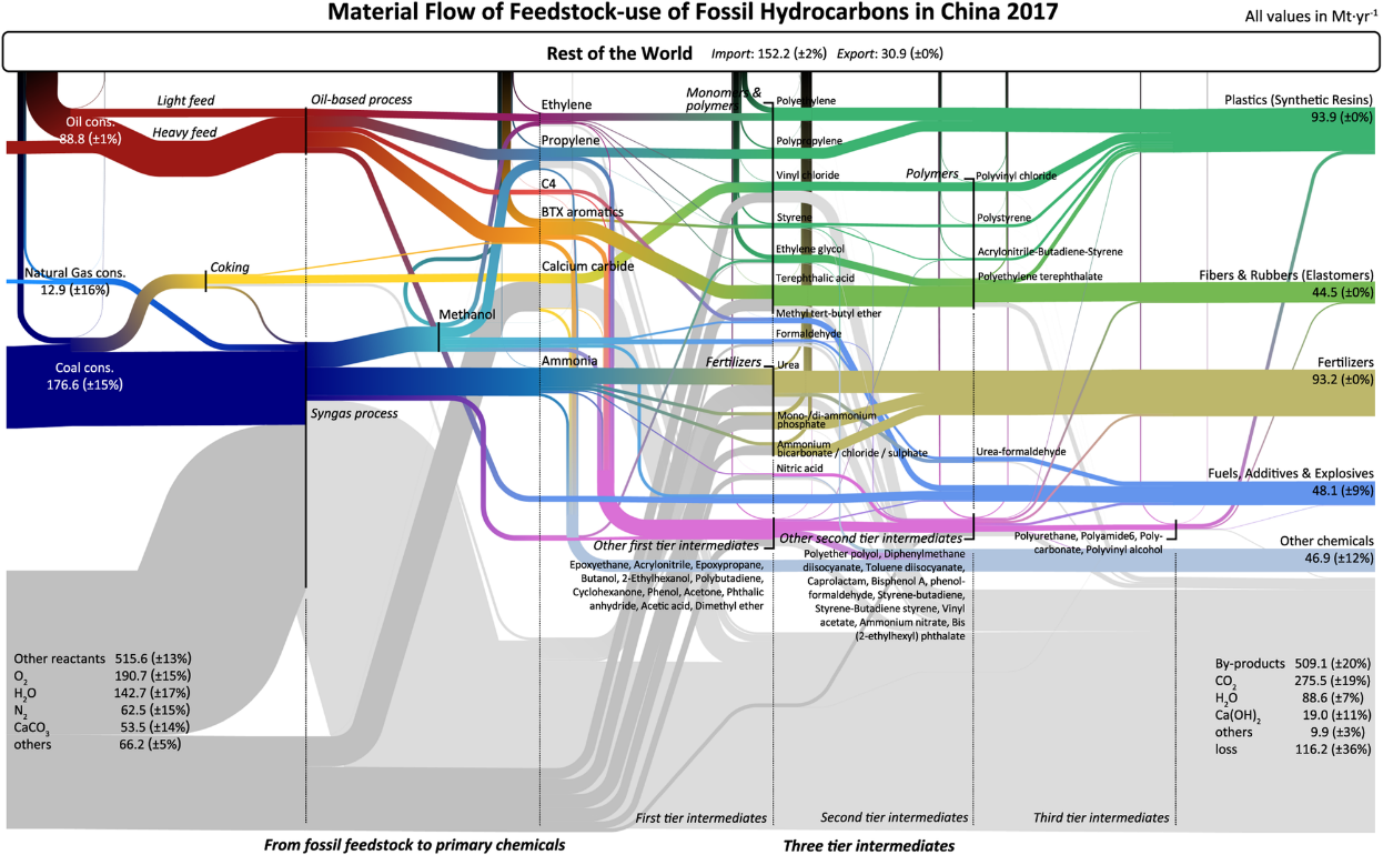 对煤炭、石油和天然气等化石资源的利用是人类社会工业化进程的主要驱动力。从全球来看,目前有约90%的化石资源作为燃料使用(例如火电、燃油等),另外约10%主要用于化工行业,作为生产塑料、化学品和化肥等的原料。而随着气候治理推进,各国已达成在能源系统中转型脱离化石燃料的共识,化石资源的燃料-原料利用比例未来可能会发生很大变化。但是,目前对化石资源代谢模式,尤其是化石资源作为原料利用的物质流网络的量化研究并不深入,主要缘于相关产品和过程的多样性和复杂性。