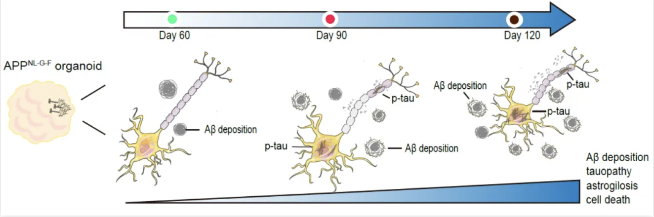 图1.APPNL-G-F人源性类脑器官模型在时间维度依次呈现AD关键病理特征