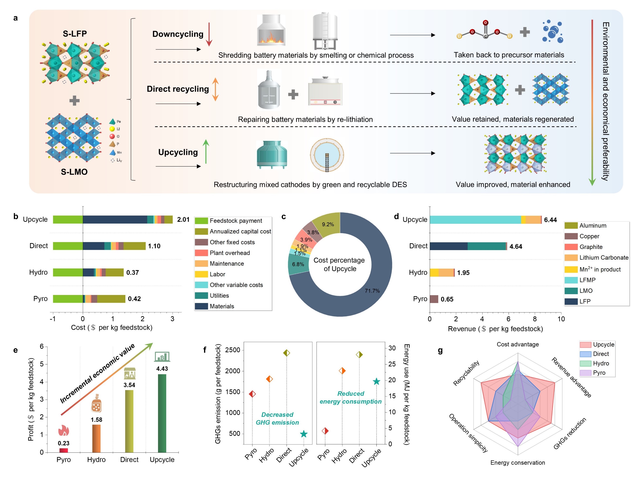 清华大学深圳国际研究生院周光敏副教授,中国科学院深圳先进院与金属研究所、深圳理工大学(筹)成会明院士,上海交通大学梁正副教授团队提出了一种针对混合失效正极材料(LFP+LMO)的升级回收策略,以绿色环保的低共熔溶剂为介质,通过结构调控和过渡金属替换,将其转变为更高能量密度的聚阴离子型正极材料。再生磷酸锰铁锂正极材料的中值电压和能量密度分别提升至3.68V(相对于Li/Li+)和559 Wh/kg,均高于商业LFP(3.38 V和524Wh/kg)。该策略可以实现混合正极中的全元素回收和溶剂的循环利用,同时可扩展合成其他高电压磷酸盐材料。经济性分析表明,升级回收策略具有更高的经济和环境效益,为回收低价值的混合正极材料升级为下一代正极材料提供了一种新思路。