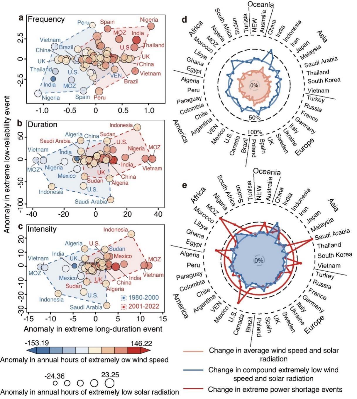 6月18日,相关研究成果以“气候变化对全球风光系统极端电力短缺事件的影响”(Climate change impacts on the extreme power shortage events of wind-solar supply systems worldwide during 1980–2022)为题,在《自然·通讯》(Nature Communications)在线发表。