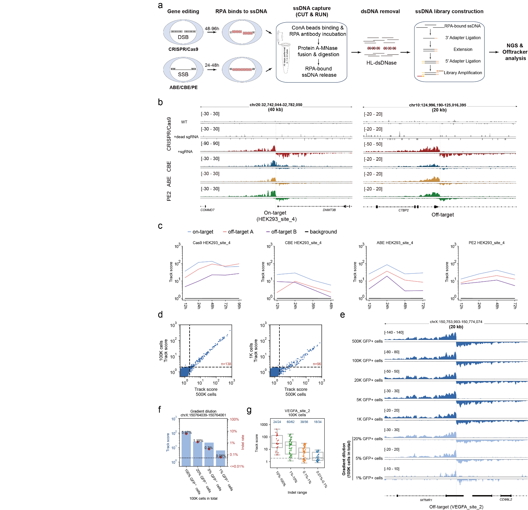 目前的主流基因编辑器均依赖于DNA损伤后的修复过程实现基因编辑,复制蛋白A(replication protein A, RPA)广泛存在于基因组双链及单链损伤修复过程,Tracking-seq通过CUT&RUN技术特异性地识别并捕获与RPA结合的单链DNA(Single-stranded DNA, ssDNA),随后利用链特异性核酸酶消化双链DNA以提高信噪比,构建链特异性ssDNA文库进行高通量测序,并通过新开发的算法精确计算RPA信号强度,进而实现对多种编辑工具的脱靶检测。