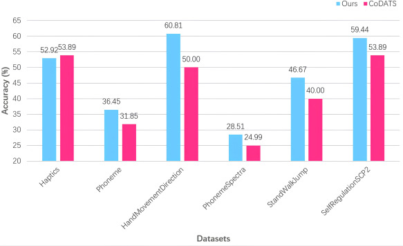 以能够自动适配最佳感受野的OS-CNN为基础分类器,研究团队在此基础上将存在样本缺乏且不存在类别不均衡等其他不利因素的难分类公开时间序列分类数据集作为目标域,并随机选取与之弱相关的时间序列分类数据集作为源域开展实验后可以发现,从弱相关时间序列分类数据集进行迁移的效果可能与从其他角度入手的深度学习分类方法、集成了多种统计学习方法的时间序列分类器达到相匹敌的准确度。此外,通过对现有的时间序列迁移学习架构进行增加尺寸变换等模块并将它们应用于弱相关时间序列分类任务间的迁移学习场景,并把得到的结果与所提架构进行比较,可以进一步论证本架构的有效性。